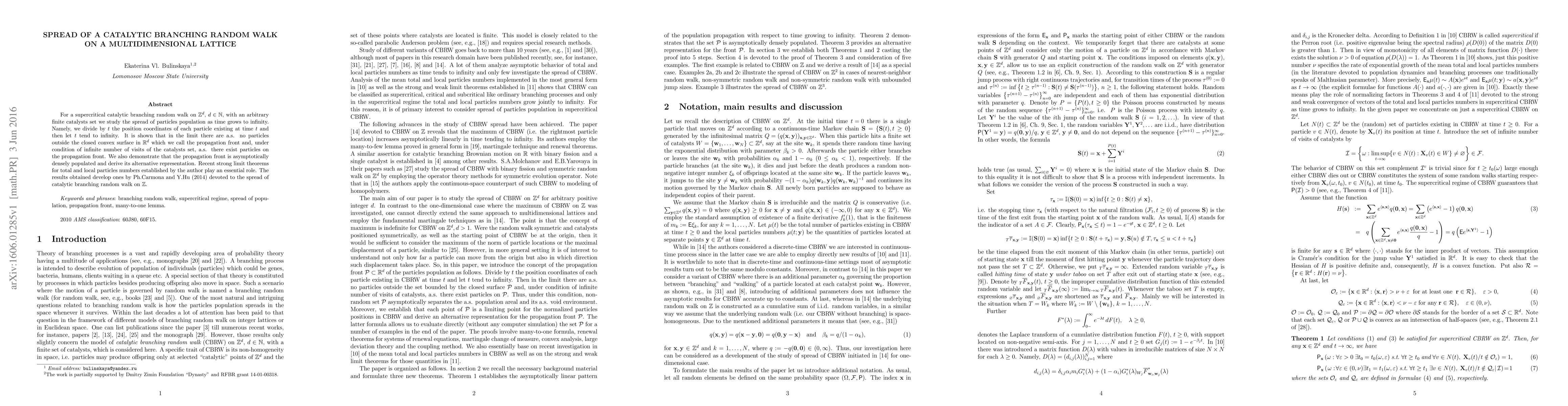 This paper investigates the asymptotic behavior of a supercritical catalytic branching random walk on a multidimensional lattice, demonstrating that particles spread to form a propagation front—a closed convex surface in R^d. Under certain conditions, particles are shown to exist on this front, which is densely populated. The study builds on recent limit theorems and extends previous results on the spread of such walks.
