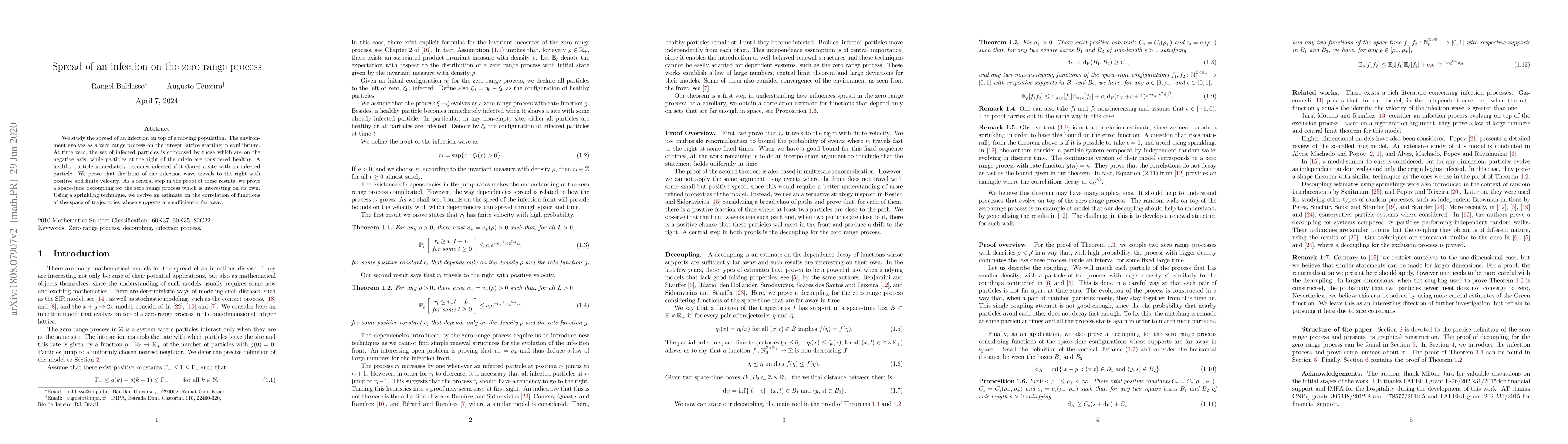 Researchers study how a disease spreads through a moving population on an integer lattice, proving that the infection front travels to the right at a positive and finite velocity. They also discover a space-time decoupling for the zero range process, which has implications for understanding other complex systems.