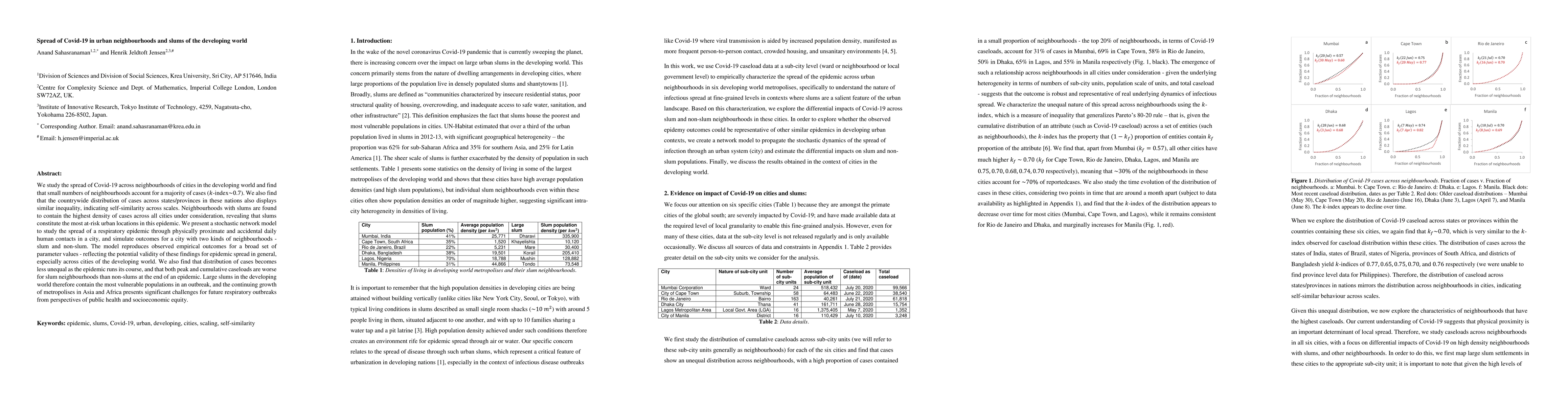 We study the spread of Covid-19 across neighbourhoods of cities in the developing world and find that small numbers of neighbourhoods account for a majority of cases (k-index~0.7). We also find that the countrywide distribution of cases across states/provinces in these nations also displays similar inequality, indicating self-similarity across scales. Neighbourhoods with slums are found to contain the highest density of cases across all cities under consideration, revealing that slums constitute the most at-risk urban locations in this epidemic. We present a stochastic network model to study the spread of a respiratory epidemic through physically proximate and accidental daily human contacts in a city, and simulate outcomes for a city with two kinds of neighbourhoods - slum and non-slum. The model reproduces observed empirical outcomes for a broad set of parameter values - reflecting the potential validity of these findings for epidemic spread in general, especially across cities of the developing world. We also find that distribution of cases becomes less unequal as the epidemic runs its course, and that both peak and cumulative caseloads are worse for slum neighbourhoods than non-slums at the end of an epidemic. Large slums in the developing world therefore contain the most vulnerable populations in an outbreak, and the continuing growth of metropolises in Asia and Africa presents significant challenges for future respiratory outbreaks from perspectives of public health and socioeconomic equity.