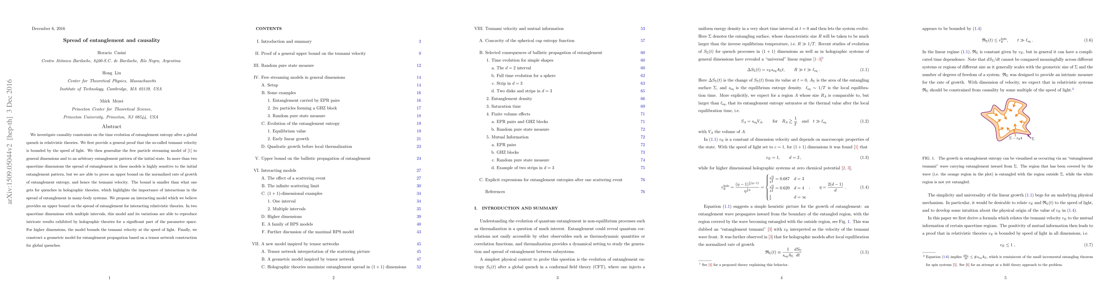 We investigate causality constraints on the time evolution of entanglement entropy after a global quench in relativistic theories. We first provide a general proof that the so-called tsunami velocity is bounded by the speed of light. We then generalize the free particle streaming model of arXiv:cond-mat/0503393 to general dimensions and to an arbitrary entanglement pattern of the initial state. In more than two spacetime dimensions the spread of entanglement in these models is highly sensitive to the initial entanglement pattern, but we are able to prove an upper bound on the normalized rate of growth of entanglement entropy, and hence the tsunami velocity. The bound is smaller than what one gets for quenches in holographic theories, which highlights the importance of interactions in the spread of entanglement in many-body systems. We propose an interacting model which we believe provides an upper bound on the spread of entanglement for interacting relativistic theories. In two spacetime dimensions with multiple intervals, this model and its variations are able to reproduce intricate results exhibited by holographic theories for a significant part of the parameter space. For higher dimensions, the model bounds the tsunami velocity at the speed of light. Finally, we construct a geometric model for entanglement propagation based on a tensor network construction for global quenches.