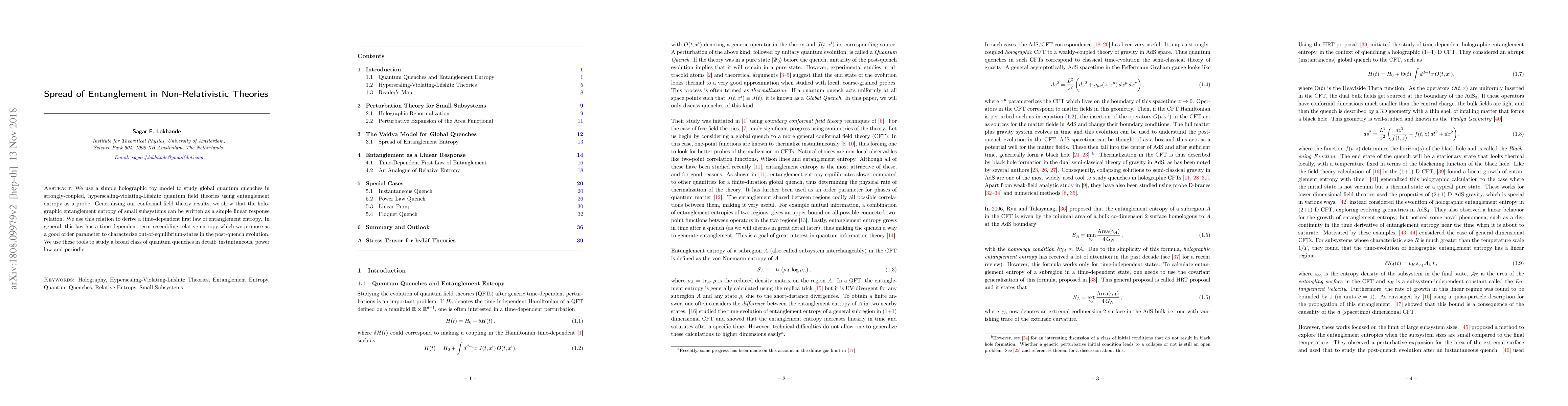 We use a simple holographic toy model to study global quantum quenches in strongly-coupled, hyperscaling-violating-Lifshitz quantum field theories using entanglement entropy as a probe. Generalizing our results in arxiv:1705.10324 , we show that the holographic entanglement entropy of small subsystems can be written as a simple linear response relation. We use this relation to derive a time-dependent first law of entanglement entropy. In general, this law has a time-dependent term resembling relative entropy which we propose as a good order parameter to characterize out-of-equilibrium-states in the post-quench evolution. We use these tools to study a broad class of quantum quenches in detail: instantaneous, power law and periodic.