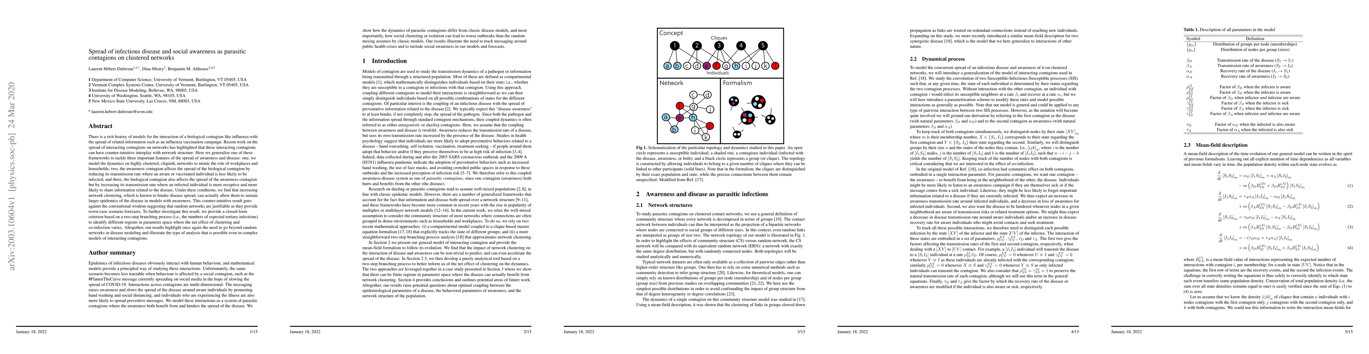 This paper models the interplay between infectious disease spread and social awareness on clustered networks, showing that increased clustering can sustain larger epidemics when awareness affects disease transmission. The study uses a two-step branching process to identify regions where the combined effects of clustering and awareness vary.