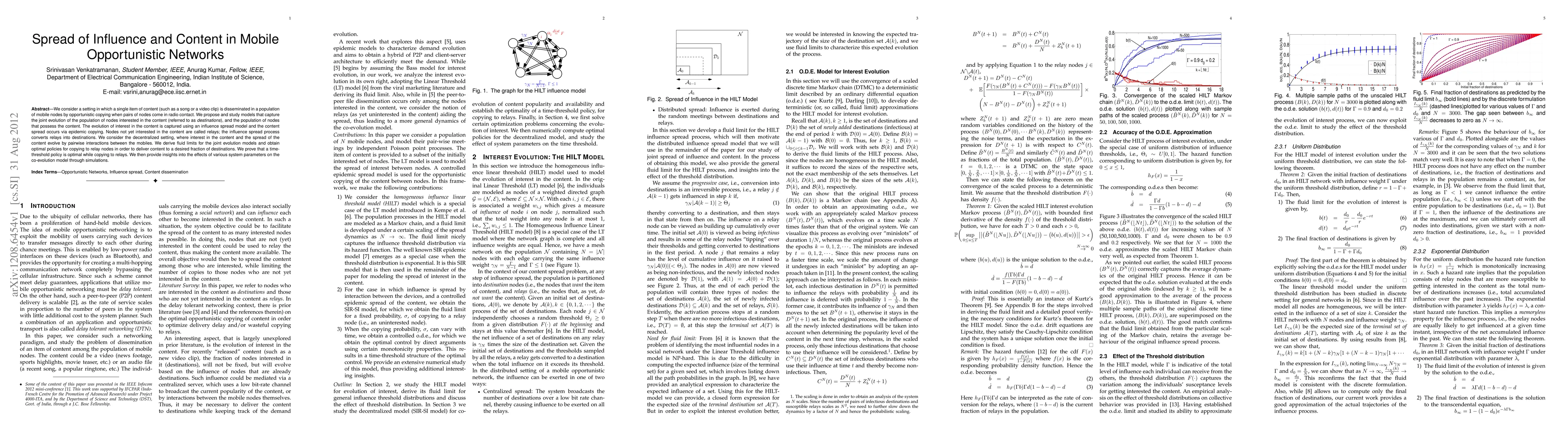 We consider a setting in which a single item of content (such as a song or a video clip) is disseminated in a population of mobile nodes by opportunistic copying when pairs of nodes come in radio contact. We propose and study models that capture the joint evolution of the population of nodes interested in the content (referred to as destinations), and the population of nodes that possess the content. The evolution of interest in the content is captured using an influence spread model and the content spread occurs via epidemic copying. Nodes not yet interested in the content are called relays; the influence spread process converts relays into destinations. We consider the decentralized setting, where interest in the content and the spread of the content evolve by pairwise interactions between the mobiles. We derive fluid limits for the joint evolution models and obtain optimal policies for copying to relay nodes in order to deliver content to a desired fraction of destinations. We prove that a time-threshold policy is optimal while copying to relays. We then provide insights into the effects of various system parameters on the co-evolution model through simulations.
