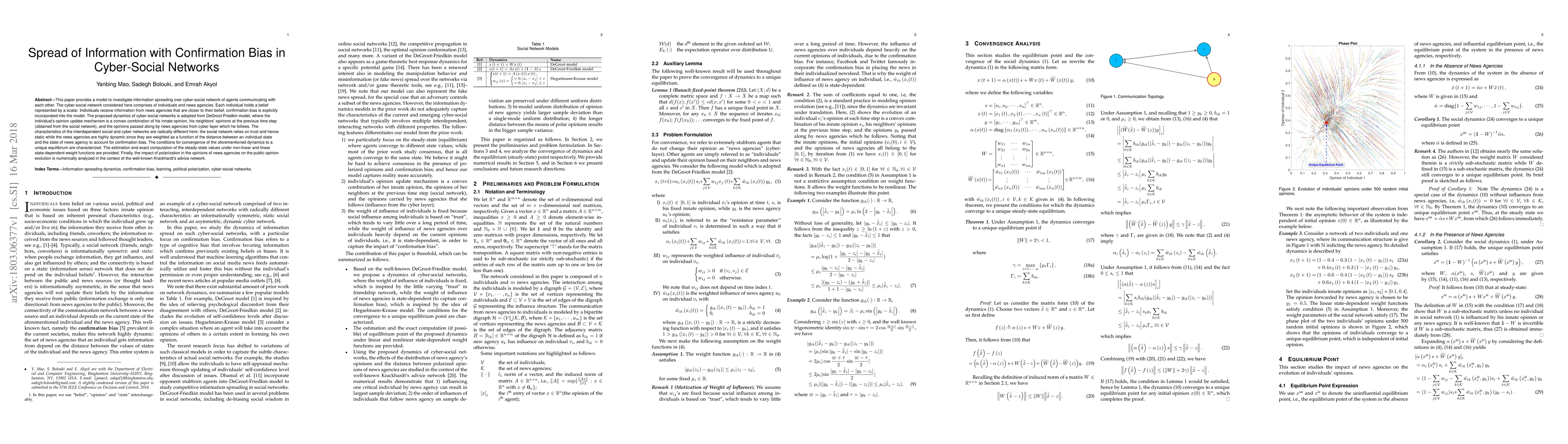 This paper models information spreading in cyber-social networks with confirmation bias, where individuals' opinions update based on their own beliefs and news agency updates weighted by distance.