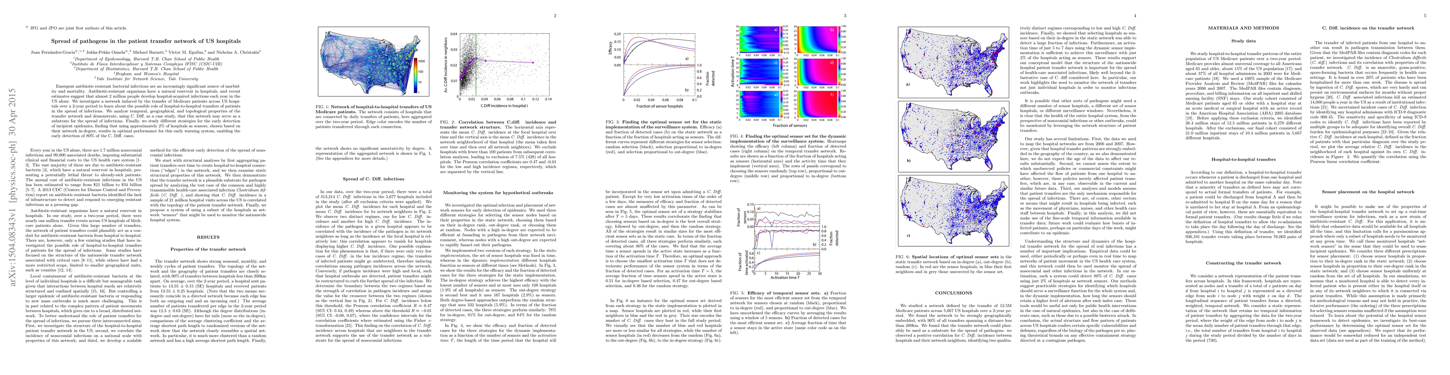 This study examines the role of patient transfers in the spread of antibiotic-resistant infections in US hospitals, using C. Diff. as a case study. It finds that hospital-to-hospital transfers can facilitate infection spread, and proposes a network-based early detection strategy that uses 2% of hospitals as sensors to identify 80% of C. Diff. cases early.