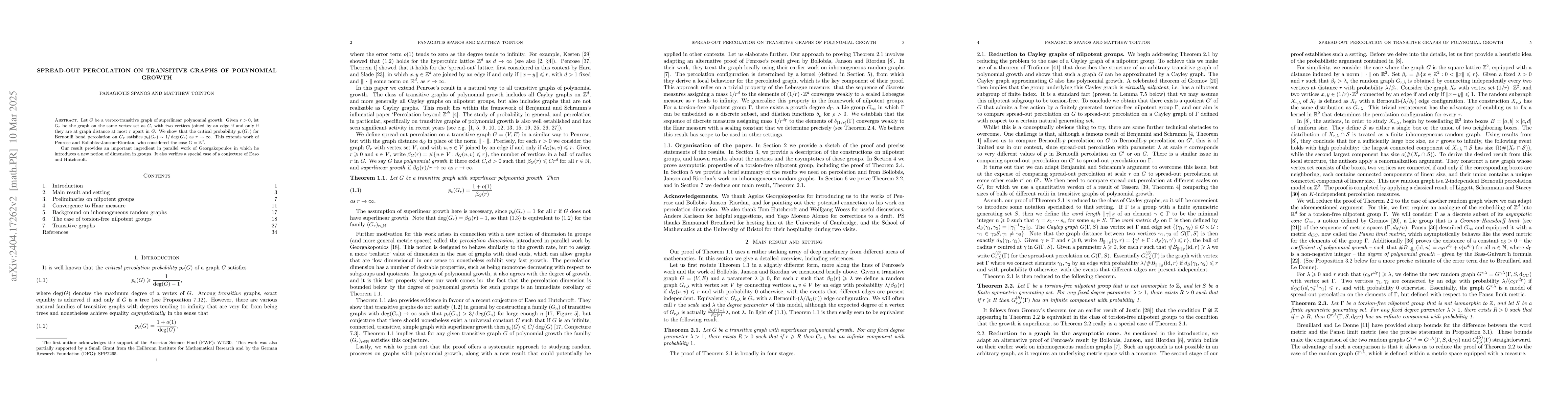 The paper investigates spread-out percolation on vertex-transitive graphs with superlinear polynomial growth, proving that the critical probability for bond percolation behaves asymptotically like the reciprocal of the degree as the range parameter tends to infinity. This extends previous results to a broader class of graphs beyond just $\mathbb{Z}^d$.