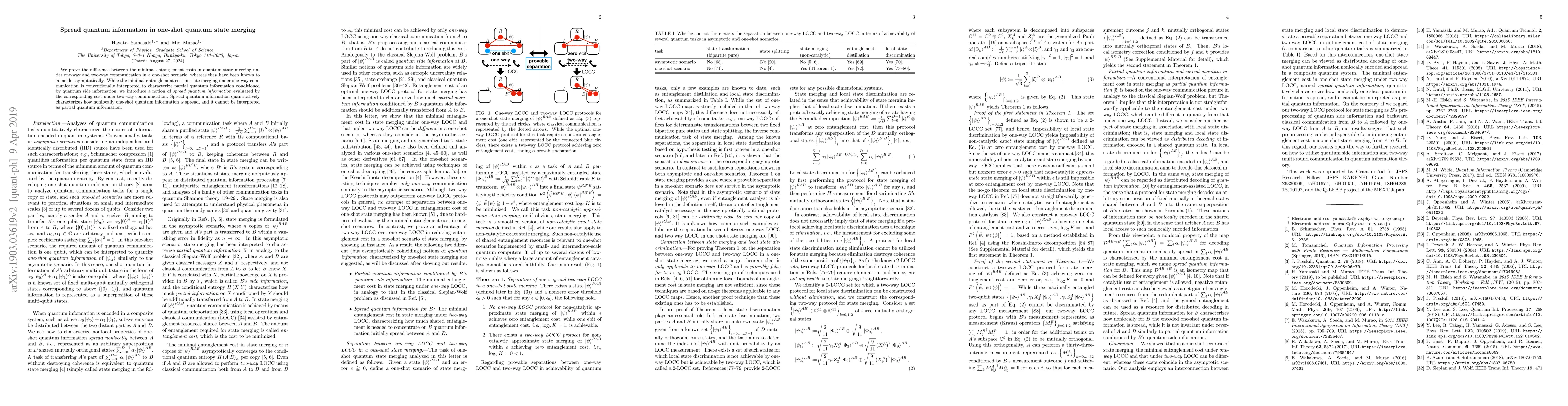 This paper demonstrates the difference in minimal entanglement costs for merging quantum states under one-way versus two-way communication in a one-shot scenario. It introduces the concept of spread quantum information, which quantifies nonlocal one-shot quantum information spread, differing from partial quantum information.