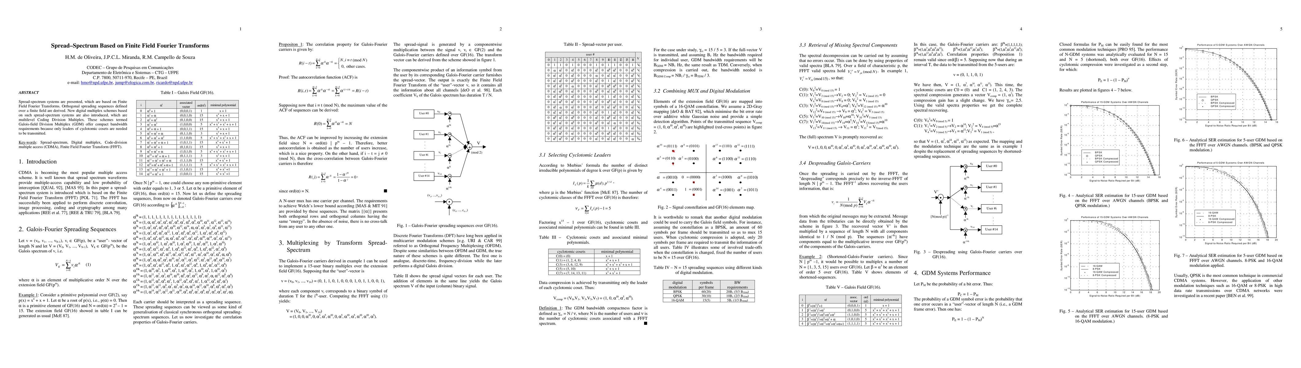 This paper introduces spread-spectrum systems based on Finite Field Fourier Transforms, deriving orthogonal spreading sequences over a finite field and proposing new digital multiplex schemes, namely Galois-field Division Multiplex (GDM), which require minimal bandwidth by transmitting only leaders of cyclotomic cosets.