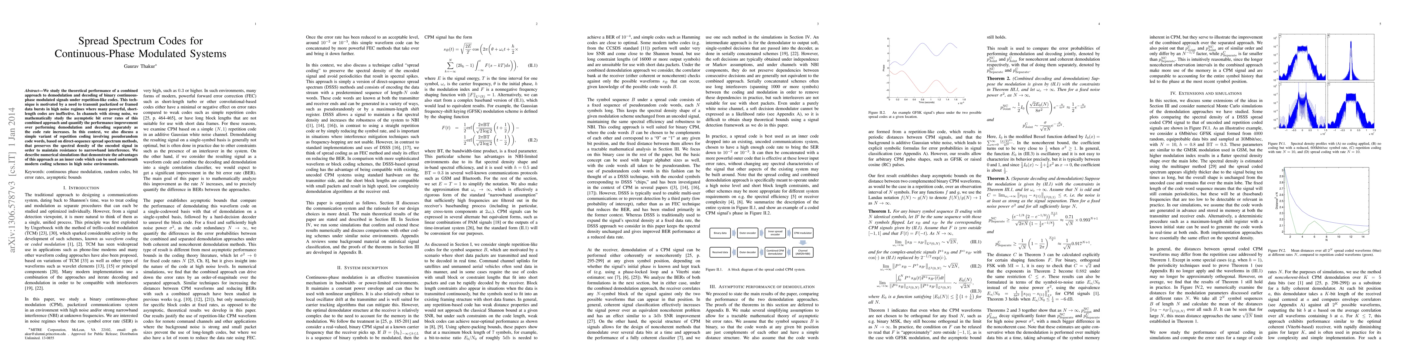 We study the theoretical performance of a combined approach to demodulation and decoding of binary continuous-phase modulated signals under repetition-like codes. This technique is motivated by a need to transmit packetized or framed data bursts in high noise regimes where many powerful, short-length codes are ineffective. In channels with strong noise, we mathematically study the asymptotic bit error rates of this combined approach and quantify the performance improvement over performing demodulation and decoding separately as the code rate increases. In this context, we also discuss a simple variant of repetition coding involving pseudorandom code words, based on direct-sequence spread spectrum methods, that preserves the spectral density of the encoded signal in order to maintain resistance to narrowband interference. We describe numerical simulations that demonstrate the advantages of this approach as an inner code which can be used underneath modern coding schemes in high noise environments.