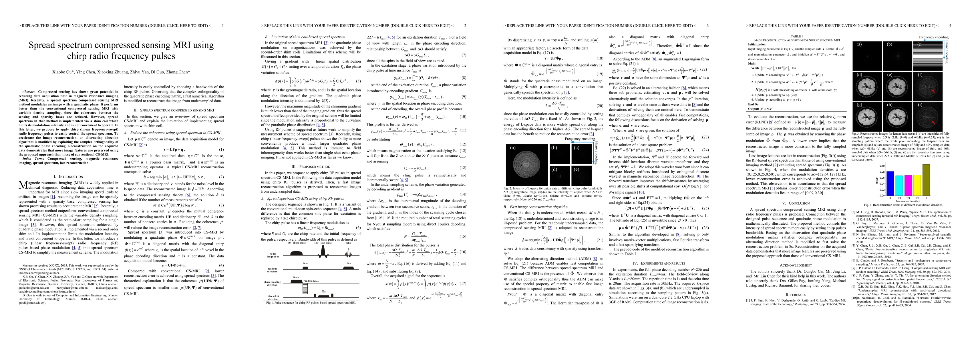This paper proposes using chirp radio frequency pulses for spread spectrum compressed sensing MRI to enhance image reconstruction efficiency. The method preserves more image features compared to conventional compressed sensing MRI, offering a more convenient and effective modulation technique.