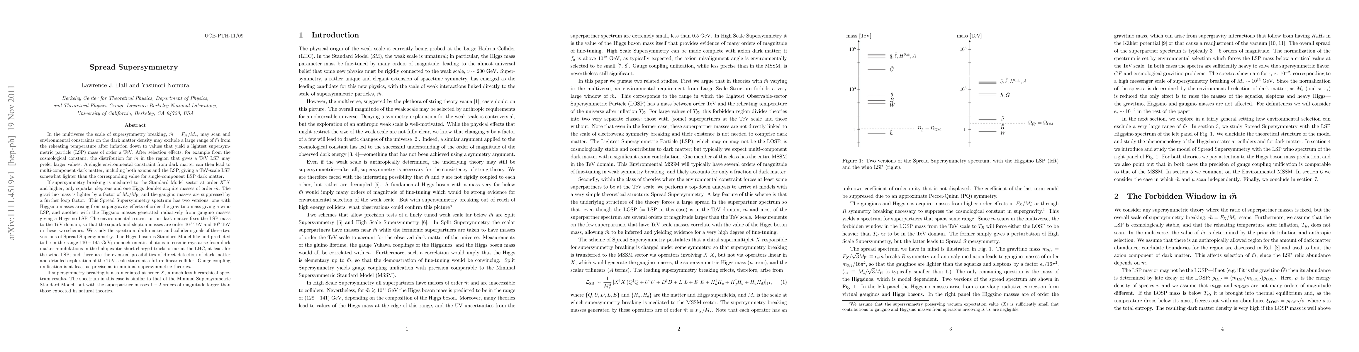 This paper explores "Spread Supersymmetry," a model where the scale of SUSY breaking varies across the multiverse, leading to a preference for larger values of \tilde{m}. It discusses two versions of this spectrum, one with a wino and another with a Higgsino as the lightest supersymmetric particle (LSP), both yielding a TeV-scale LSP. The model predicts distinct collider signals and dark matter properties, including the potential for direct detection and exploration at future colliders.