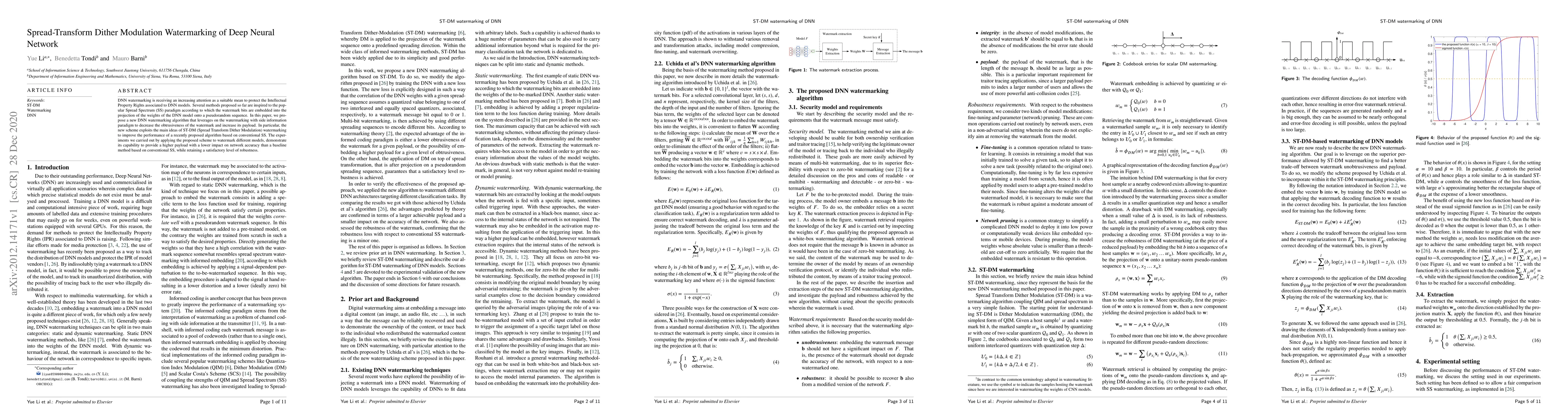 This paper introduces a novel DNN watermarking algorithm that utilizes the Spread Transform Dither Modulation (ST-DM) paradigm to embed watermarks with lower obtrusiveness and higher payload. Experiments show it outperforms conventional Spread Spectrum methods by providing better accuracy preservation and robustness.
