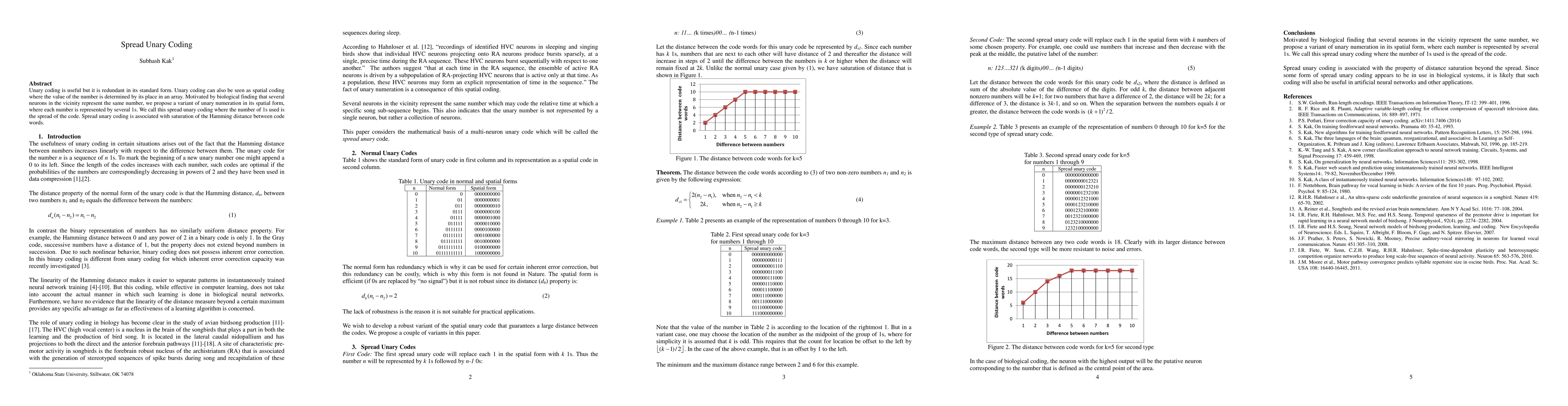 Spread unary coding proposes a variant of unary coding that uses multiple 1s to represent a number, reducing redundancy and enhancing Hamming distance saturation between code words. This approach is inspired by biological findings of neuron representation.