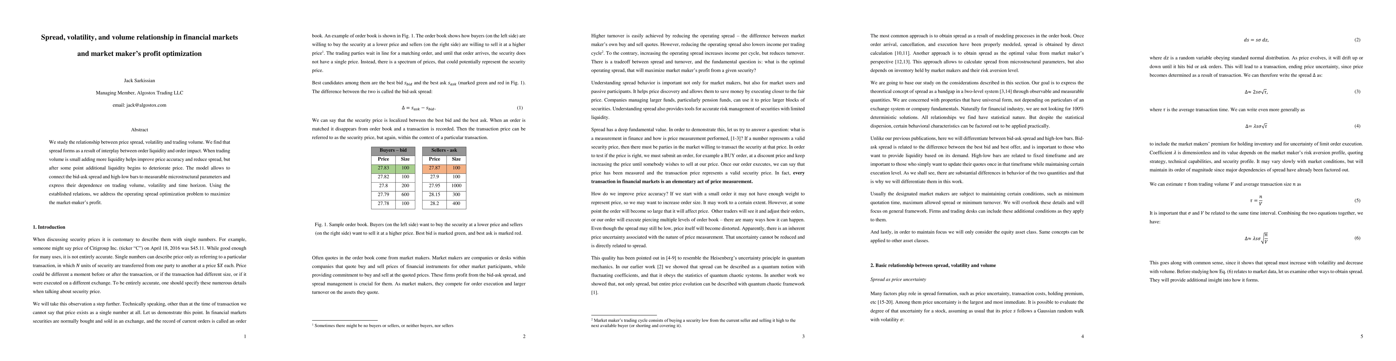 This paper investigates the interplay between price spread, volatility, and trading volume in financial markets, finding that spread is influenced by order liquidity and impact. It proposes a model linking bid-ask spread and high-low bars to microstructural parameters, optimizing market-making profit by maximizing spread.