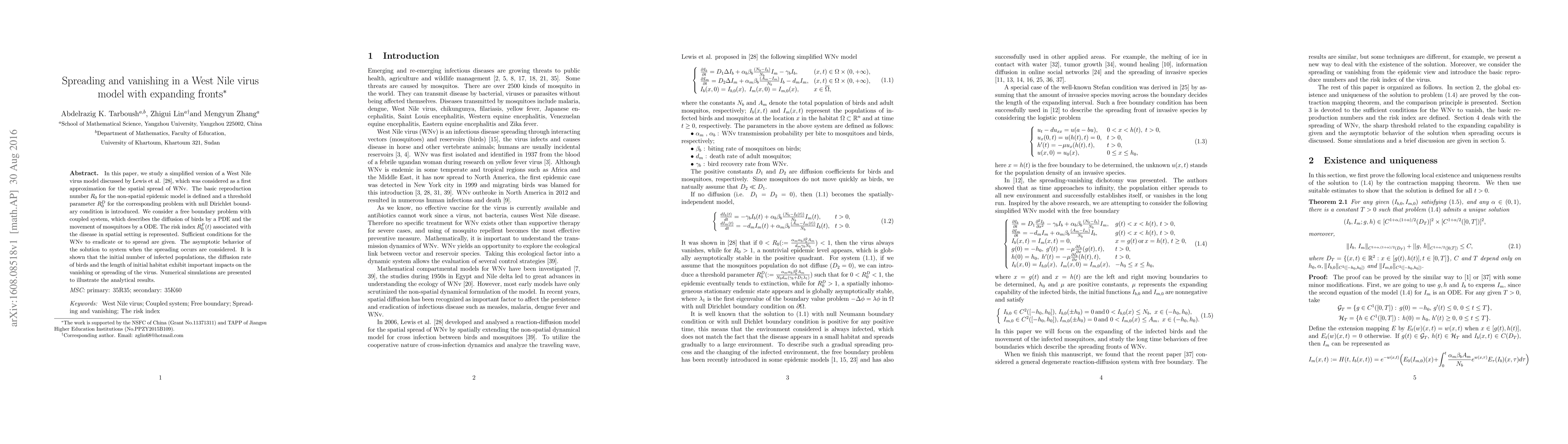 This paper investigates a simplified West Nile virus model with spatial spread, defining the basic reproduction number and introducing a threshold parameter for disease spread. It examines the impact of initial infected populations, bird diffusion rates, and habitat length on the virus's eradication or spread, supported by numerical simulations.