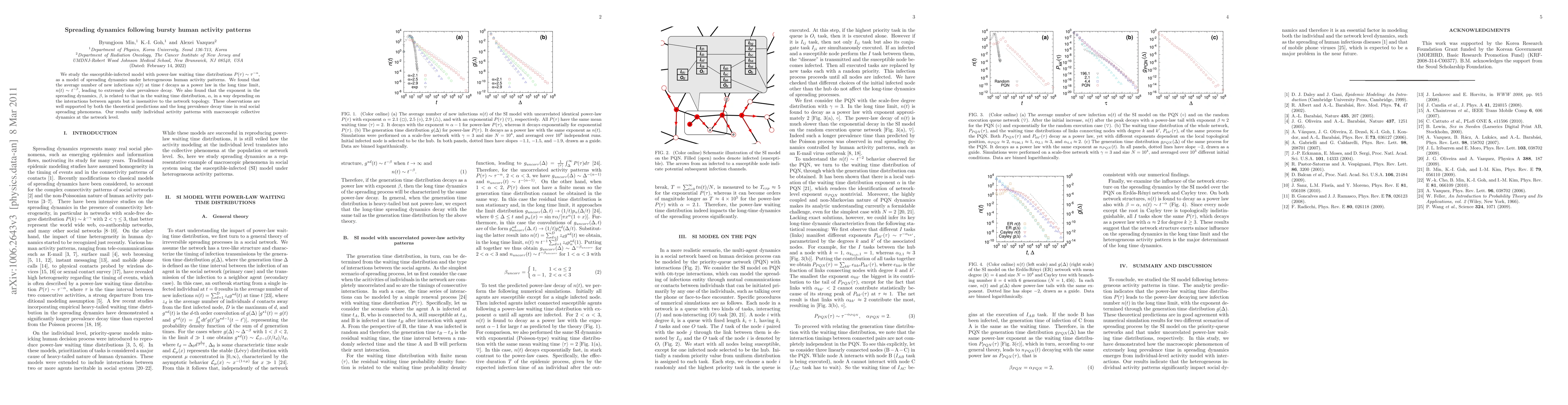 This research examines the susceptible-infected model under heterogeneous human activity patterns, revealing that the average number of new infections decays as a power law over time, leading to slow prevalence decay. The study finds a relationship between the decay exponent in the spreading dynamics and the waiting time distribution, unaffected by network topology, aligning theoretical predictions with real social spreading phenomena.