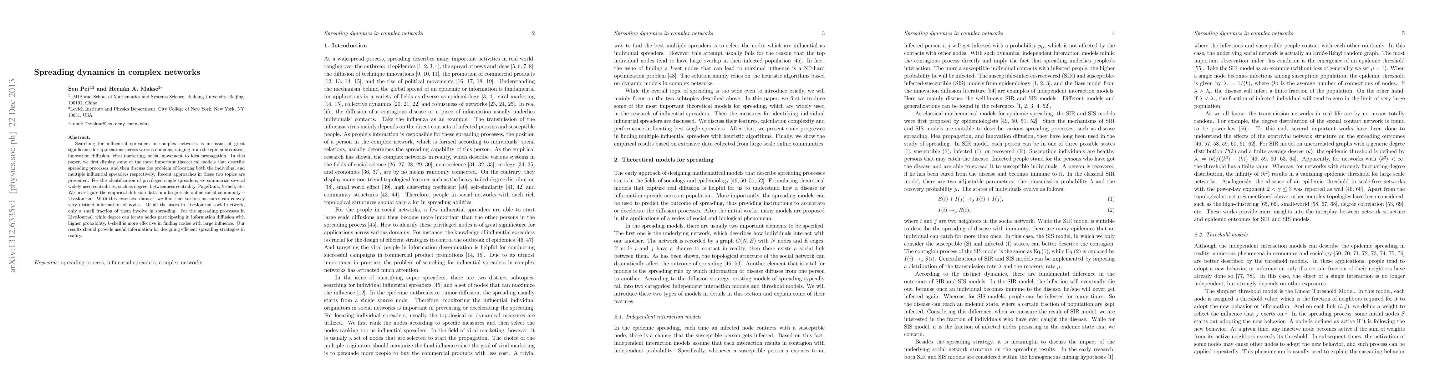 Searching for influential spreaders in complex networks is an issue of great significance for applications across various domains, ranging from the epidemic control, innovation diffusion, viral marketing, social movement to idea propagation. In this paper, we first display some of the most important theoretical models that describe spreading processes, and then discuss the problem of locating both the individual and multiple influential spreaders respectively. Recent approaches in these two topics are presented. For the identification of privileged single spreaders, we summarize several widely used centralities, such as degree, betweenness centrality, PageRank, k-shell, etc. We investigate the empirical diffusion data in a large scale online social community -- LiveJournal. With this extensive dataset, we find that various measures can convey very distinct information of nodes. Of all the users in LiveJournal social network, only a small fraction of them involve in spreading. For the spreading processes in LiveJournal, while degree can locate nodes participating in information diffusion with higher probability, k-shell is more effective in finding nodes with large influence. Our results should provide useful information for designing efficient spreading strategies in reality.