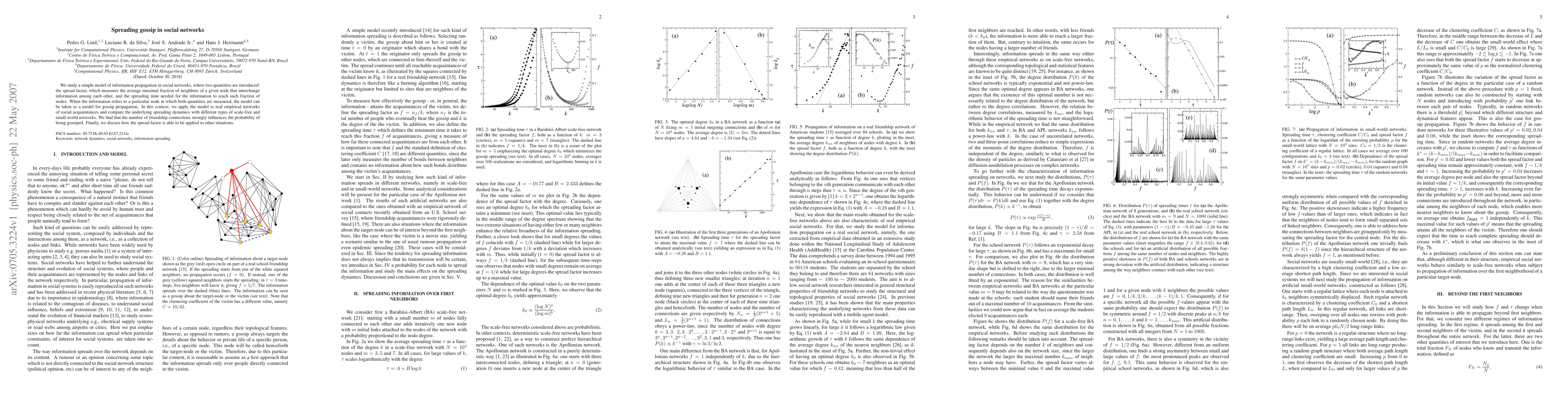 This paper models gossip propagation in social networks, introducing the spread factor and spreading time to measure information interchange. It finds that the number of friendship connections significantly affects the likelihood of gossip dissemination, and compares dynamics across various network types.