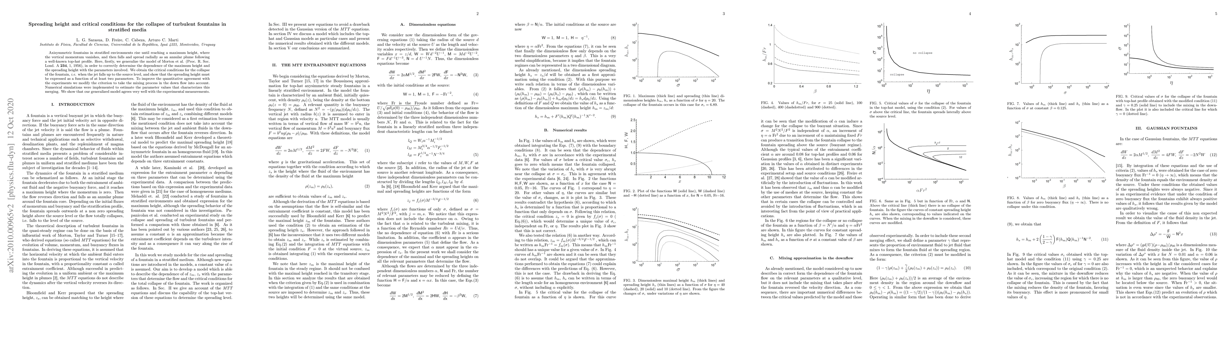 Axisymmetric fountains in stratified environments rise until reaching a maximum height, where the vertical momentum vanishes, and then falls and spread radially as an annular plume following a well-known top-hat profile. Here, firstly, we generalize the model of Morton et al. (Proc. R. Soc. Lond. A \textbf{234}, 1, 1956), in order to correctly determine the dependence of the maximum height and the spreading height with the parameters involved. We obtain the critical conditions for the collapse of the fountain, \textit i.e. when the jet falls up to the source level, and show that the spreading height must be expressed as a function of at least two parameters. To improve the quantitative agreement with the experiments we modify the criterion to take the mixing process in the down flow into account. Numerical simulations were implemented to estimate the parameter values that characterizes this merging. We show that our generalized model agrees very well with the experimental measurements.