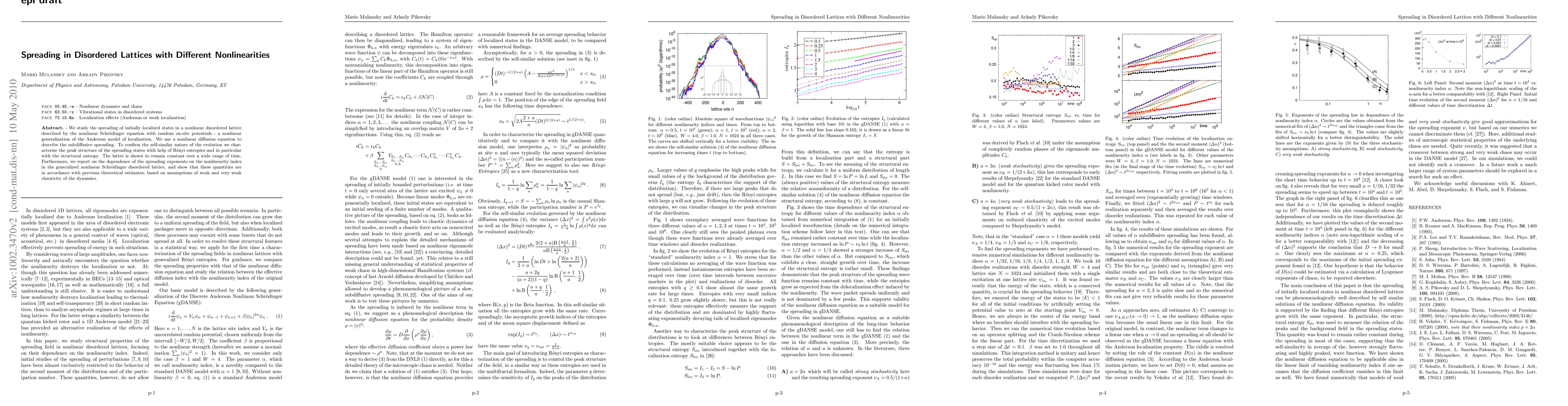 This paper investigates the spreading of localized states in disordered nonlinear lattices using a generalized nonlinear Schrödinger equation. It confirms the self-similar evolution through constant structural entropy and reports on the dependence of spreading exponents on the nonlinearity index, aligning with theoretical estimates of chaotic dynamics.