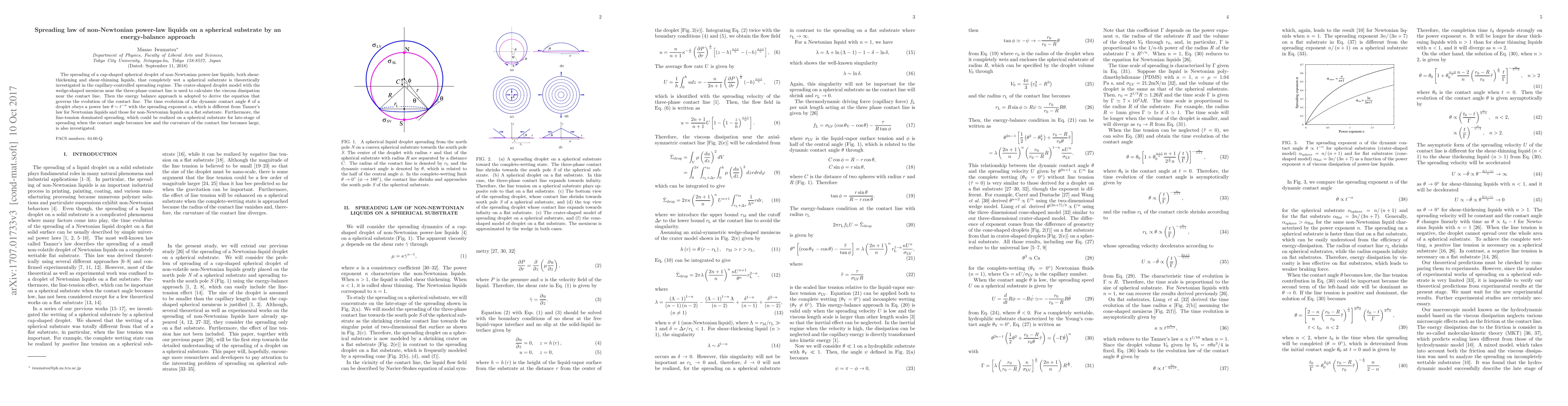 The paper presents an energy balance approach to derive the spreading law of non-Newtonian power-law liquids on a spherical substrate, considering viscous dissipation near the contact line using a crater-shaped droplet model.