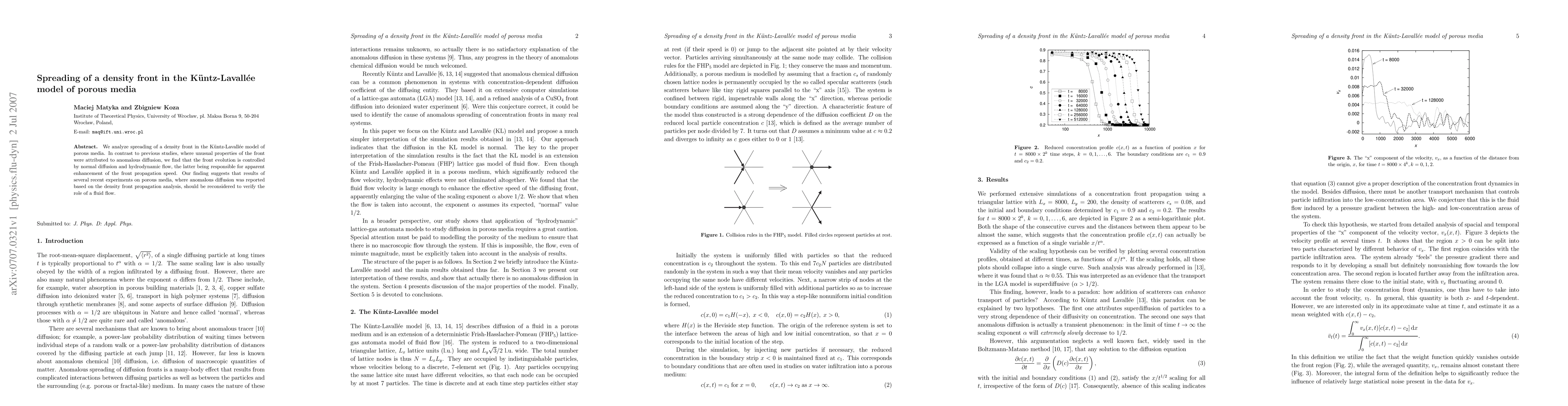 This paper investigates the spreading of a density front in the K\"untz-Lavall\'ee model of porous media, finding that normal diffusion and hydrodynamic flow, rather than anomalous diffusion, govern the front's evolution and apparent speed enhancement. It calls for reevaluation of recent experiments attributing anomalous diffusion to the density front propagation.