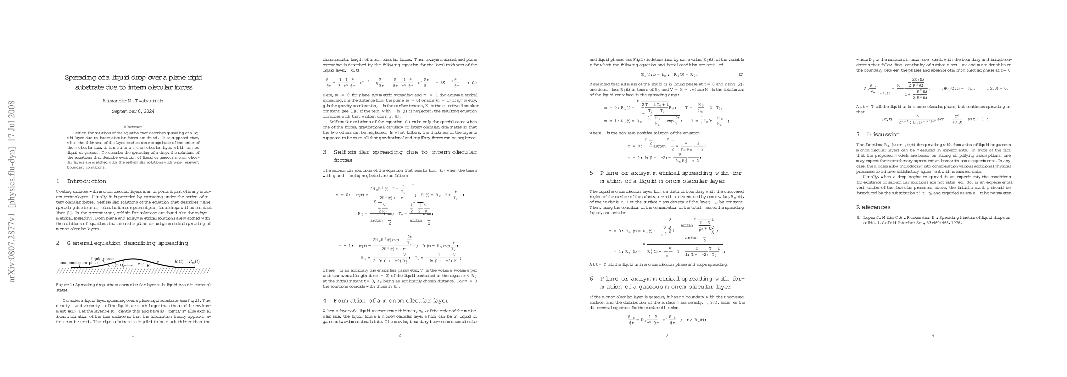 Self-similar solutions of the equation that describes spreading of a liquid layer due to intermolecular forces are found. It is supposed that, when the thickness of the layer reaches some magnitude of the order of the molecular size, it turns into a monomolecular layer, which can be liquid or gaseous. To describe the spreading of a drop, the solutions of the equations that describe evolution of liquid or gaseous monomolecular layers are matched with the self-similar solutions with using relevant boundary conditions.