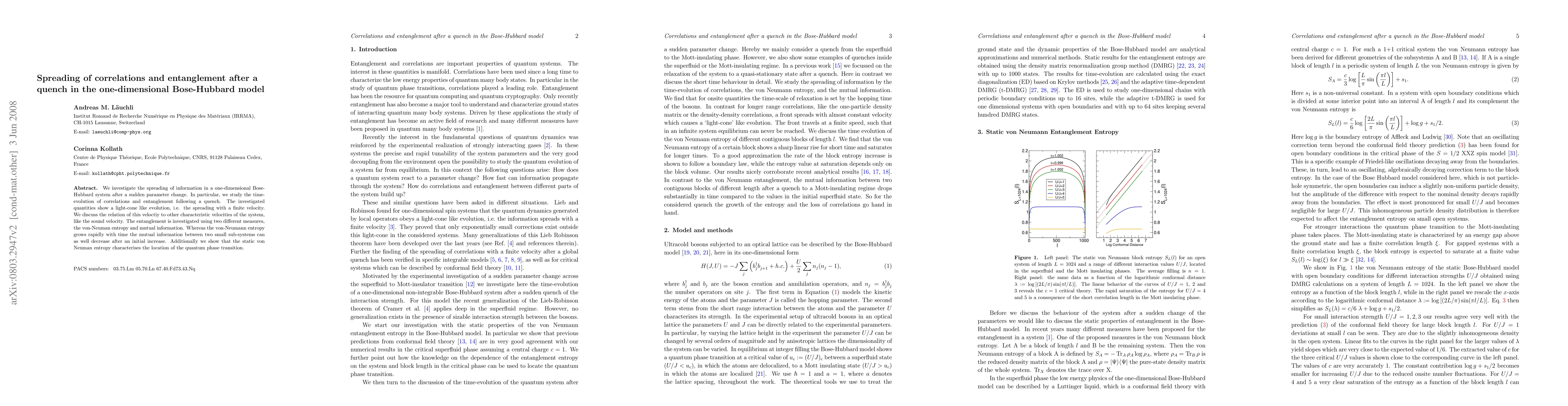 This study examines the dynamics of correlations and entanglement in a one-dimensional Bose-Hubbard model following a sudden parameter change, revealing a light-cone-like spreading with a finite velocity related to the system's sound velocity. The research uses von-Neumann entropy and mutual information to measure entanglement, finding that while entropy grows rapidly, mutual information can decrease after an initial rise.
