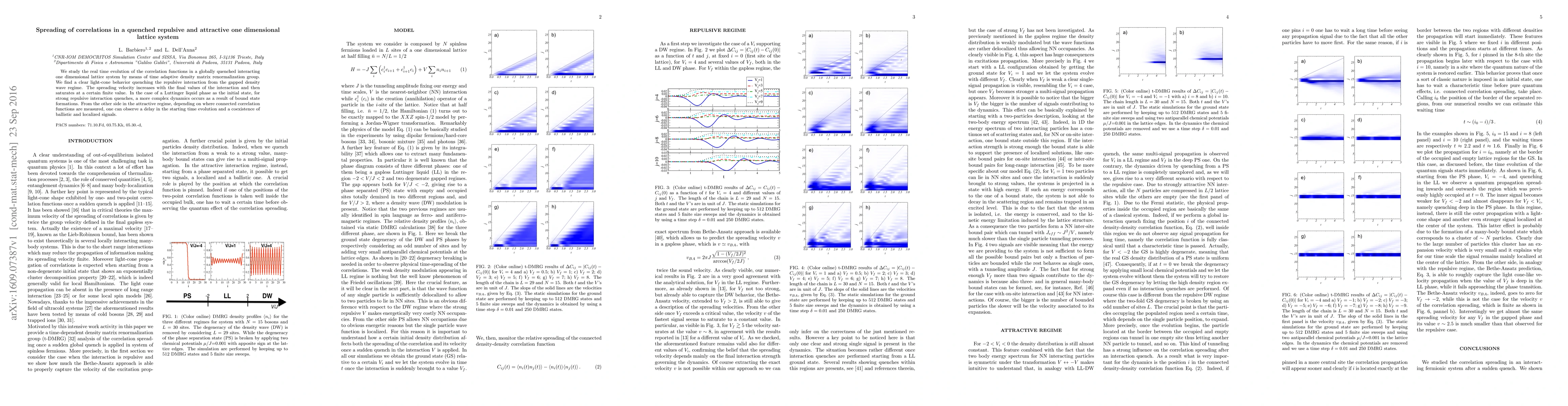 We study the real time evolution of the correlation functions in a globally quenched interacting one dimensional lattice system by means of time adaptive density matrix renormalization group. We find a clear light-cone behavior quenching the repulsive interaction from the gapped density wave regime. The spreading velocity increases with the final values of the interaction and then saturates at a certain finite value. In the case of a Luttinger liquid phase as the initial state, for strong repulsive interaction quenches, a more complex dynamics occurs as a result of bound state formations. From the other side in the attractive regime, depending on where connected correlation functions are measured, one can observe a delay in the starting time evolution and a coexistence of ballistic and localized signals.