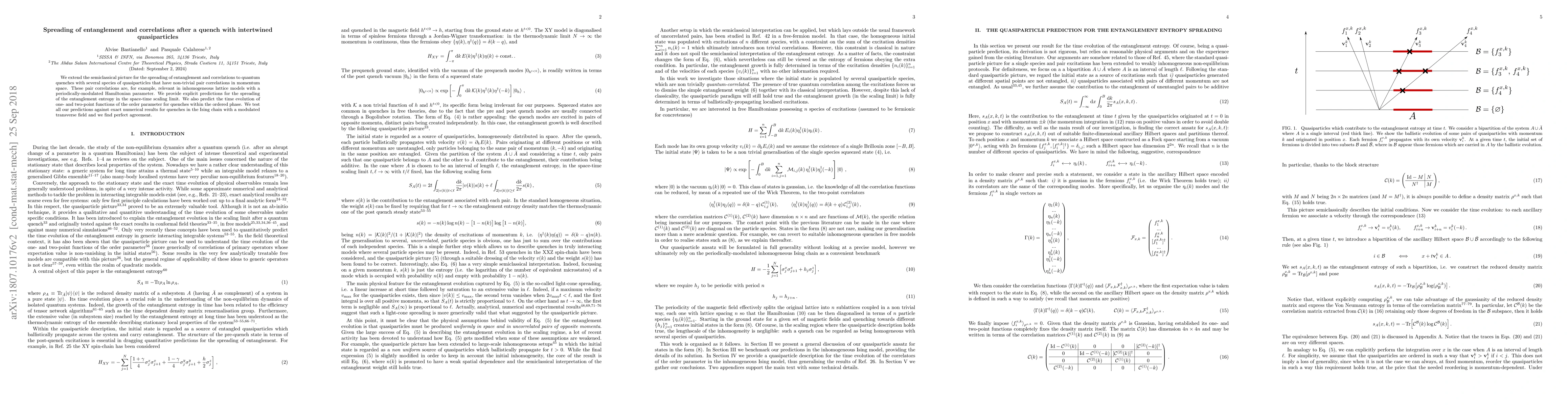 This paper extends the semiclassical framework to predict the spreading of entanglement and correlations following a quantum quench in systems with quasiparticles having non-trivial momentum space correlations. The authors provide predictions for the entanglement entropy and order parameter dynamics, which are validated against exact numerical results in the Ising chain with a modulated transverse field.