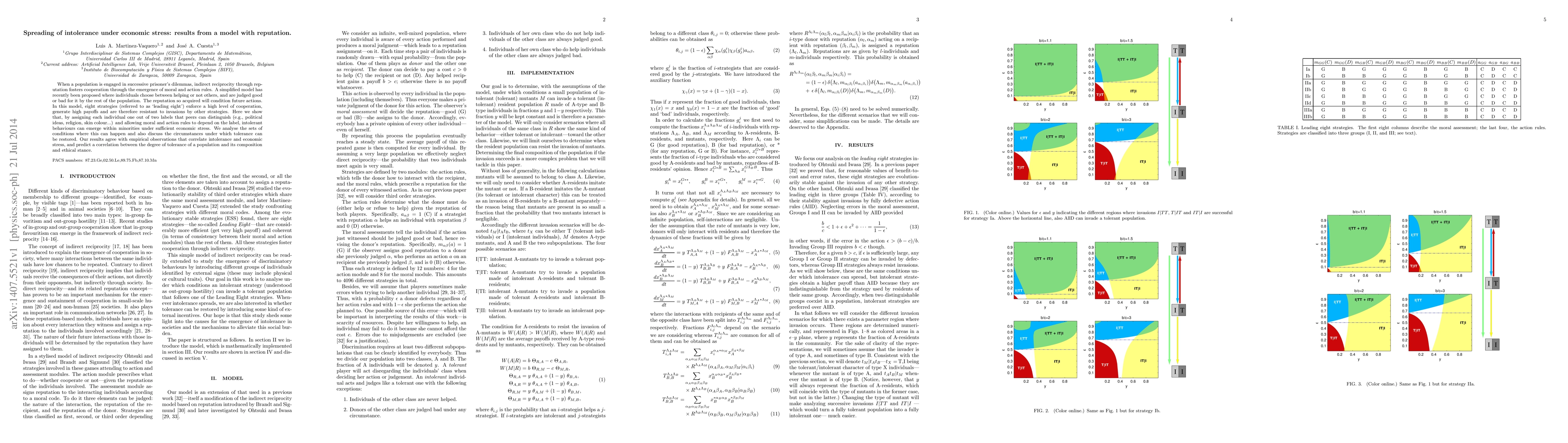 When a population is engaged in successive prisoner's dilemmas, indirect reciprocity through reputation fosters cooperation through the emergence of moral and action rules. A simplified model has recently been proposed where individuals choose between helping or not others, and are judged good or bad for it by the rest of the population. The reputation so acquired will condition future actions. In this model, eight strategies (referred to as 'leading eight') enforce a high level of cooperation, generate high payoffs and are therefore resistant to invasions by other strategies. Here we show that, by assigning each individual one out of two labels that peers can distinguish (e.g., political ideas, religion, skin colour...) and allowing moral and action rules to depend on the label, intolerant behaviours can emerge within minorities under sufficient economic stress. We analyse the sets of conditions where this can happen and also discuss the circumstances under which tolerance can be restored. Our results agree with empirical observations that correlate intolerance and economic stress, and predict a correlation between the degree of tolerance of a population and its composition and ethical stance.
