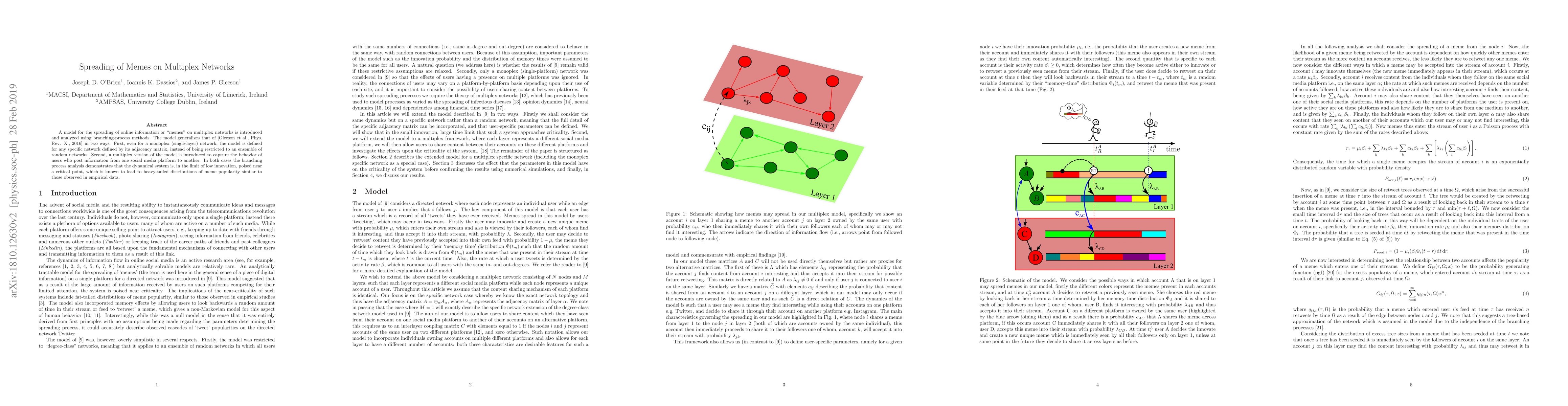 A model for the spreading of online information or "memes" on multiplex networks is introduced and analyzed using branching-process methods. The model generalizes that of [Gleeson et al., Phys.Rev. X., 2016] in two ways. First, even for a monoplex (single-layer) network, the model is defined for any specific network defined by its adjacency matrix, instead of being restricted to an ensemble of random networks. Second, a multiplex version of the model is introduced to capture the behaviour of users who post information from one social media platform to another. In both cases the branching process analysis demonstrates that the dynamical system is, in the limit of low innovation, poised near a critical point, which is known to lead to heavy-tailed distributions of meme popularity similar to those observed in empirical data.
