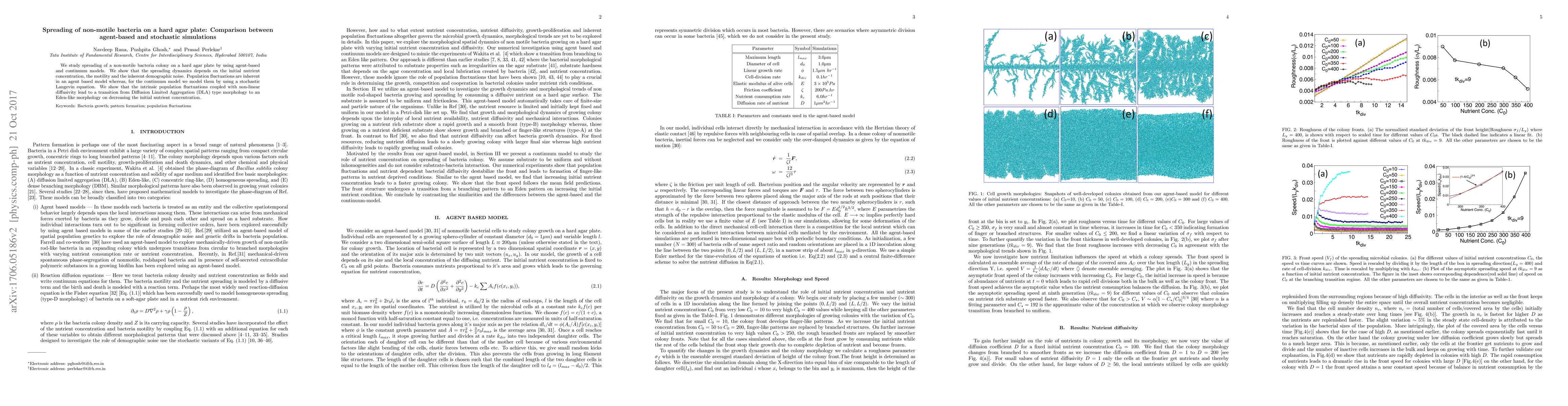 This paper compares agent-based and stochastic simulations to study the spreading dynamics of non-motile bacteria on a hard agar plate, revealing that morphology transitions from Diffusion Limited Aggregation to Eden-like as initial nutrient concentration decreases, influenced by population fluctuations and non-linear diffusivity.