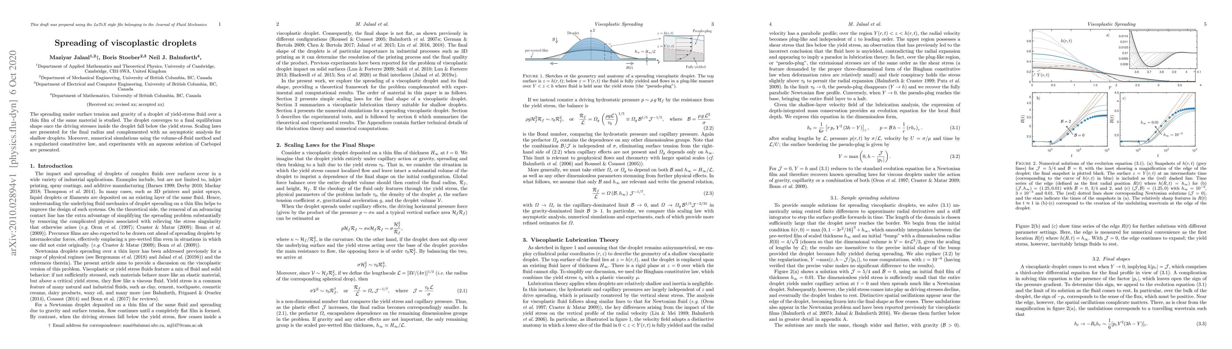 Researchers studied how a droplet of yield-stress fluid spreads on a thin film under surface tension and gravity, finding scaling laws for the final shape and providing numerical simulations and experimental results using an aqueous solution of Carbopol.