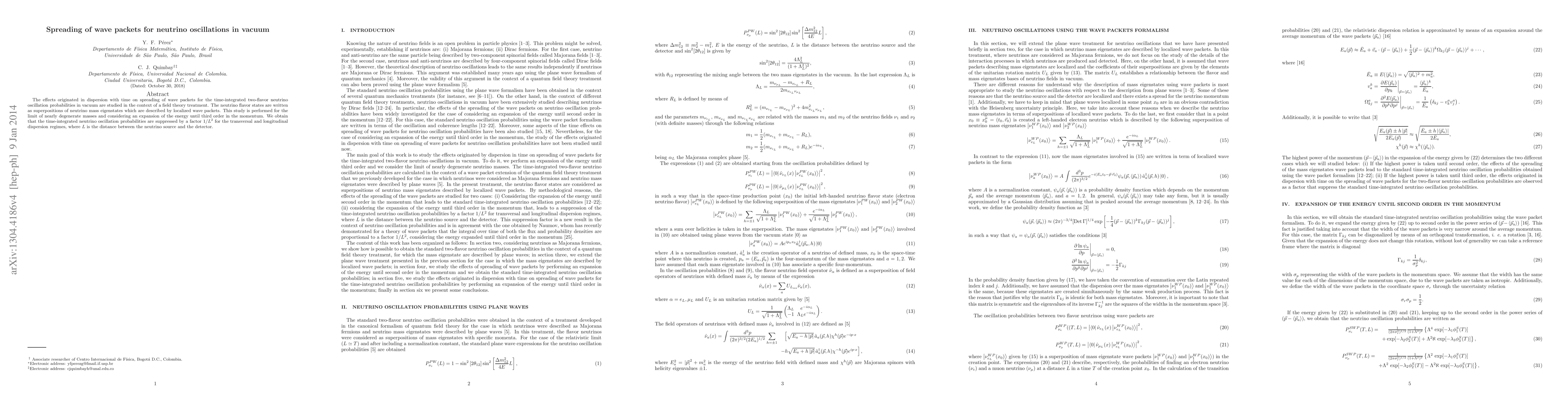 This paper investigates the dispersion effects on the spreading of wave packets for neutrino oscillations in vacuum, focusing on time-integrated two-flavor probabilities. It finds that the oscillation probabilities are suppressed by a factor of $1/L^2$ for both transversal and longitudinal dispersion, where $L$ is the source-detector distance.