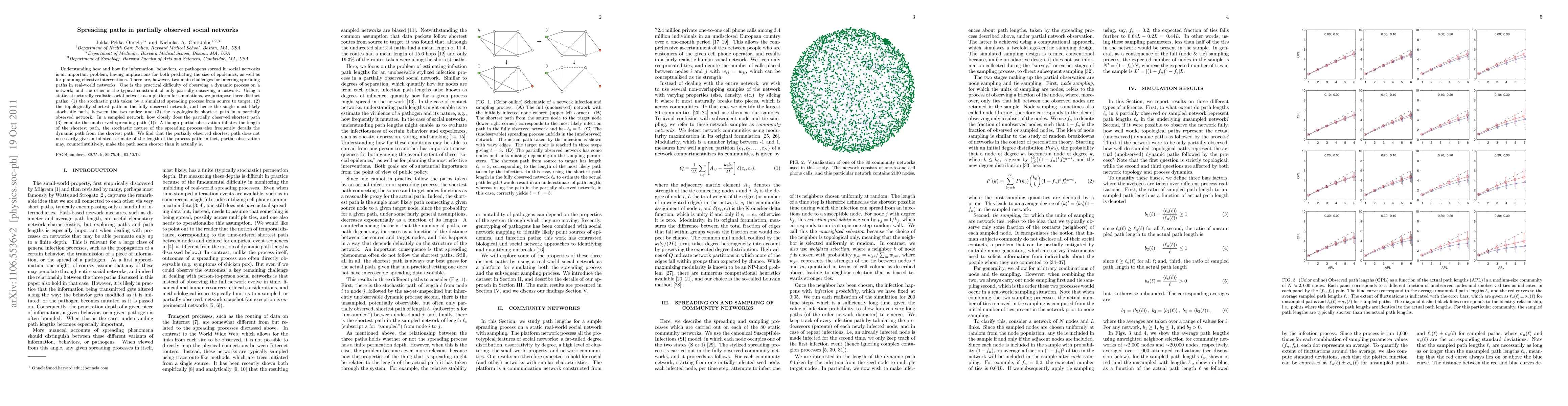 This paper explores how information spreads in partially observed social networks, comparing the actual stochastic spreading path with the topologically shortest paths in both fully and partially observed networks. It finds that partial observation can sometimes make the inferred path seem shorter than the actual spreading path, defying the expectation that it would inflate path length.