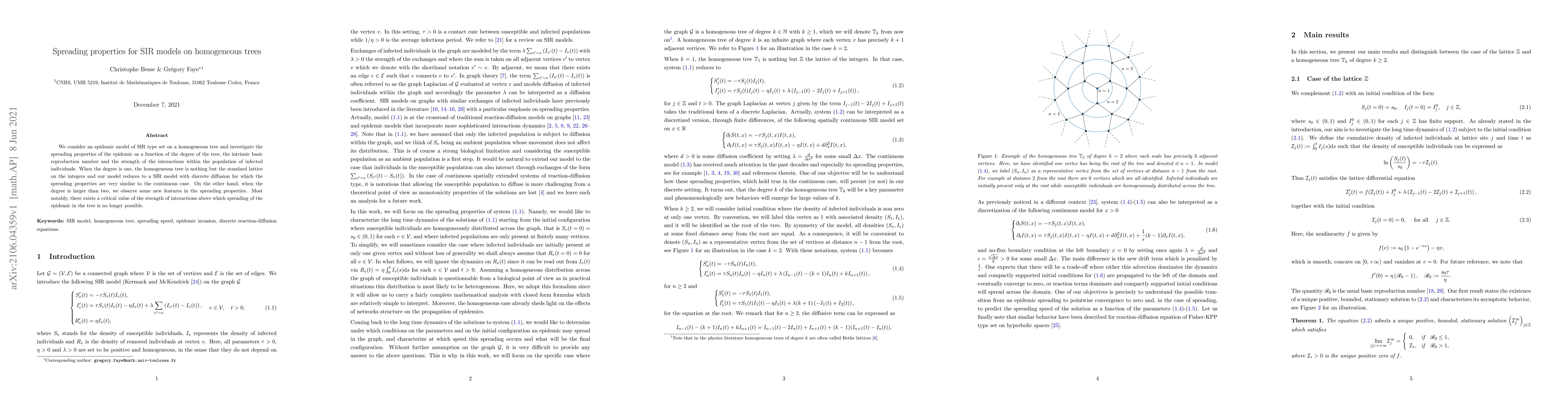 We consider an epidemic model of SIR type set on a homogeneous tree and investigate the spreading properties of the epidemic as a function of the degree of the tree, the intrinsic basic reproduction number and the strength of the interactions within the population of infected individuals. When the degree is one, the homogeneous tree is nothing but the standard lattice on the integers and our model reduces to a SIR model with discrete diffusion for which the spreading properties are very similar to the continuous case. On the other hand, when the degree is larger than two, we observe some new features in the spreading properties. Most notably, there exists a critical value of the strength of interactions above which spreading of the epidemic in the tree is no longer possible.
