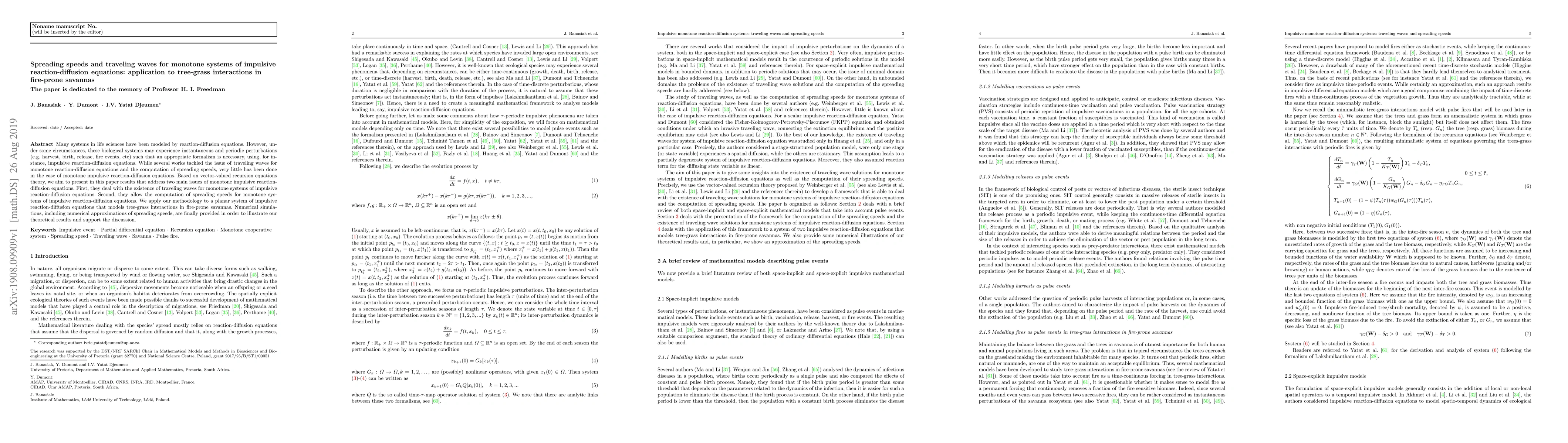 This paper investigates the existence of traveling waves and computes spreading speeds for monotone systems of impulsive reaction-diffusion equations, applying the methodology to model tree-grass interactions in fire-prone savannas. Numerical simulations support the theoretical findings.
