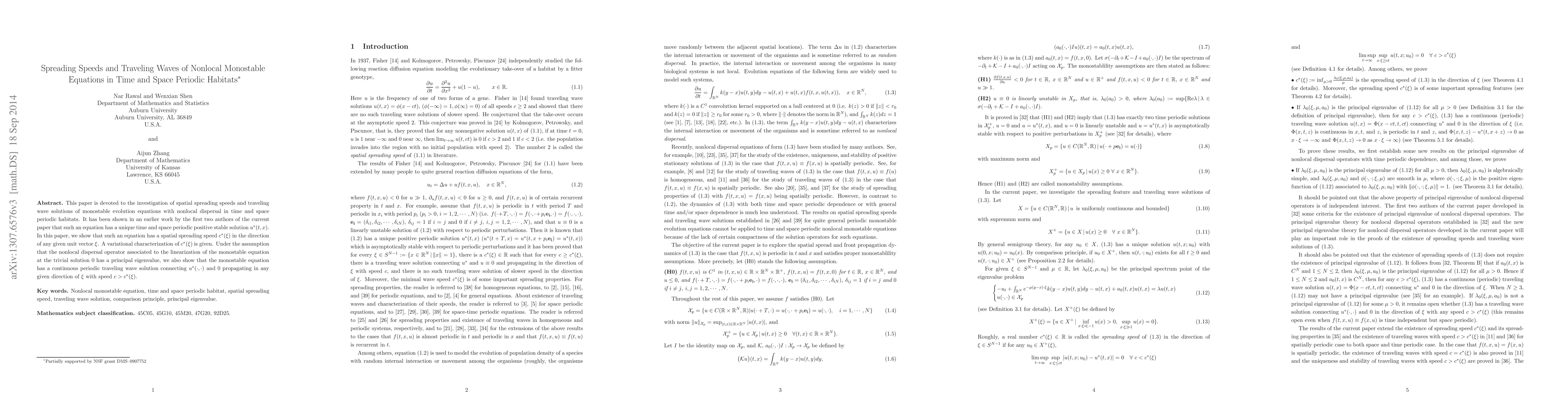 This paper investigates the spatial spreading speeds and traveling wave solutions of nonlocal monostable equations in time and space periodic habitats, demonstrating a unique positive stable solution and establishing a variational characterization for the spreading speed. It also proves the existence of continuous periodic traveling waves propagating faster than the spreading speed.
