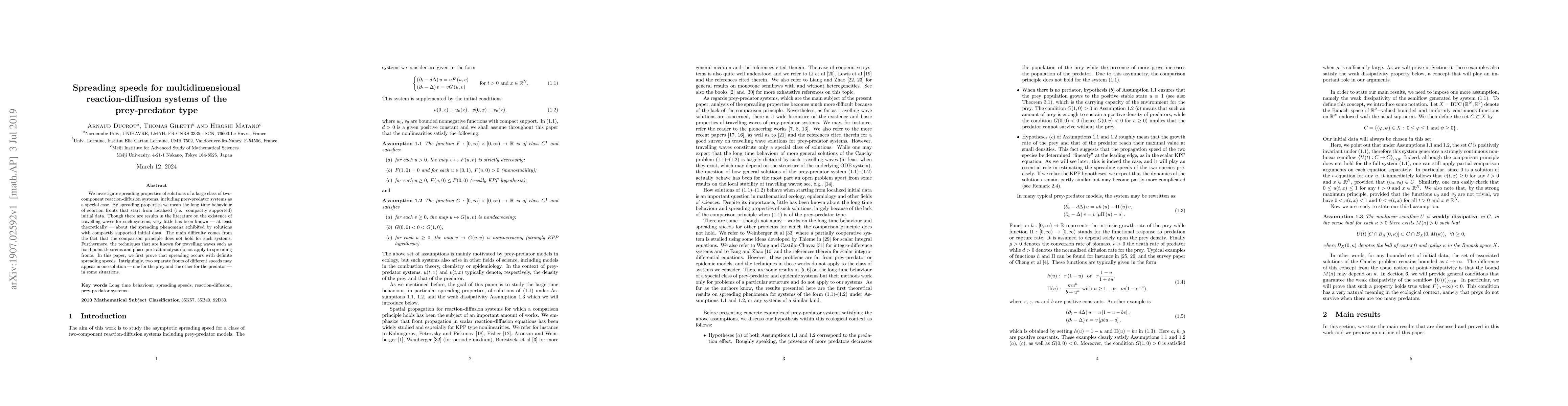 This paper investigates the spreading behavior of solutions to multidimensional reaction-diffusion systems, particularly focusing on prey-predator models. It proves the existence of definite spreading speeds and notes that separate fronts with different speeds may emerge for prey and predator populations.