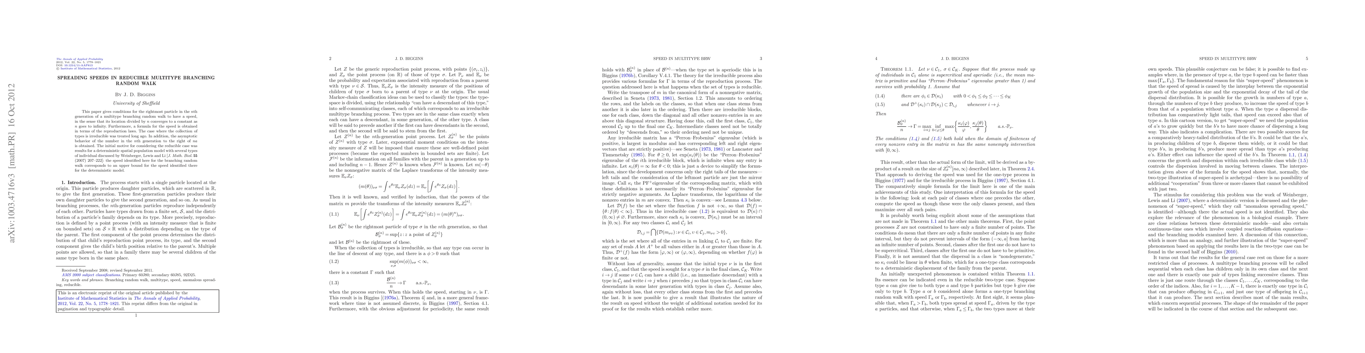This paper establishes conditions for the spreading speed of the rightmost particle in a reducible multitype branching random walk, deriving a formula for the speed based on reproduction laws. It also explores the asymptotic behavior of the population density to the right, extending previous results for the irreducible case and linking to a deterministic spatial population model.