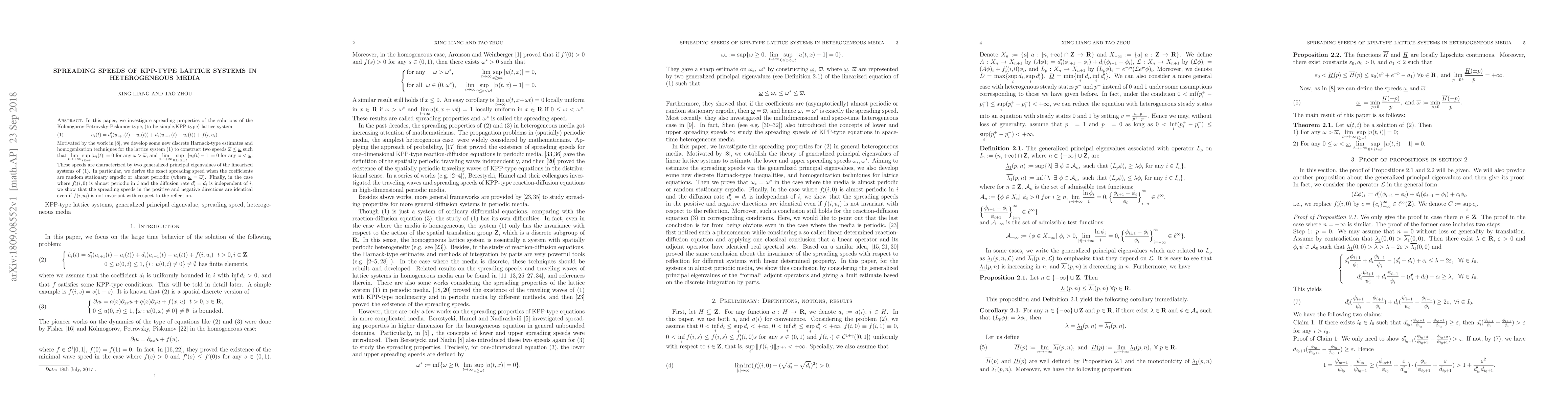 This paper explores the spreading speeds of KPP-type lattice systems in heterogeneous media, developing new discrete Harnack-type estimates and homogenization techniques to identify two critical speeds characterizing the system's behavior. The study reveals that the spreading speeds are determined by the generalized principal eigenvalues of the linearized systems, with exact spreading speed derived for random and almost periodic coefficients.