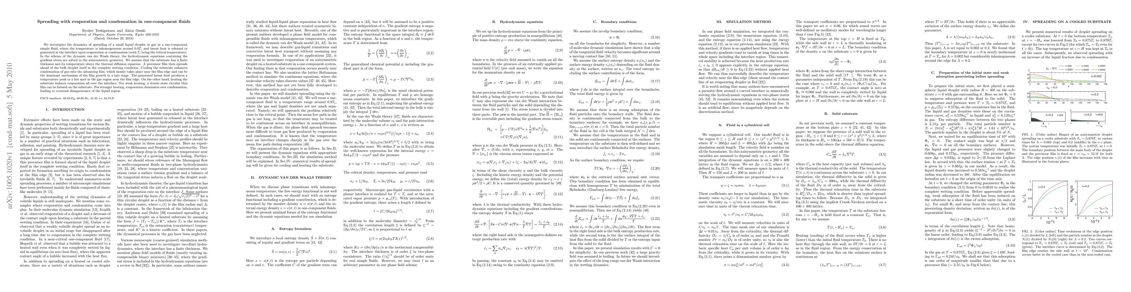 This paper explores the dynamics of droplet spreading in a one-component fluid under temperature gradients near the critical temperature, focusing on evaporation and condensation processes. It finds that substrate cooling enhances condensation near the film edge, while heating induces evaporation, potentially leading to the formation of a steady-state thin film or complete evaporation.