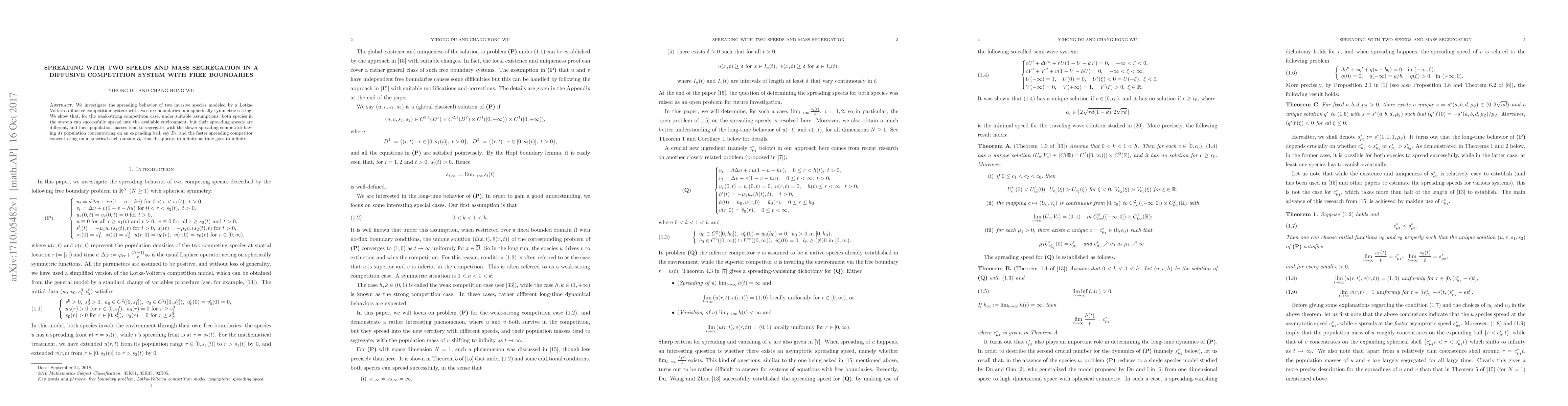 We investigate the spreading behavior of two invasive species modeled by a Lotka-Volterra diffusive competition system with two free boundaries in a spherically symmetric setting. We show that, for the weak-strong competition case, under suitable assumptions, both species in the system can successfully spread into the available environment, but their spreading speeds are different, and their population masses tend to segregate, with the slower spreading competitor having its population concentrating on an expanding ball, say Bt, and the faster spreading competitor concentrating on a spherical shell outside Bt that disappears to infinity as time goes to infinity.