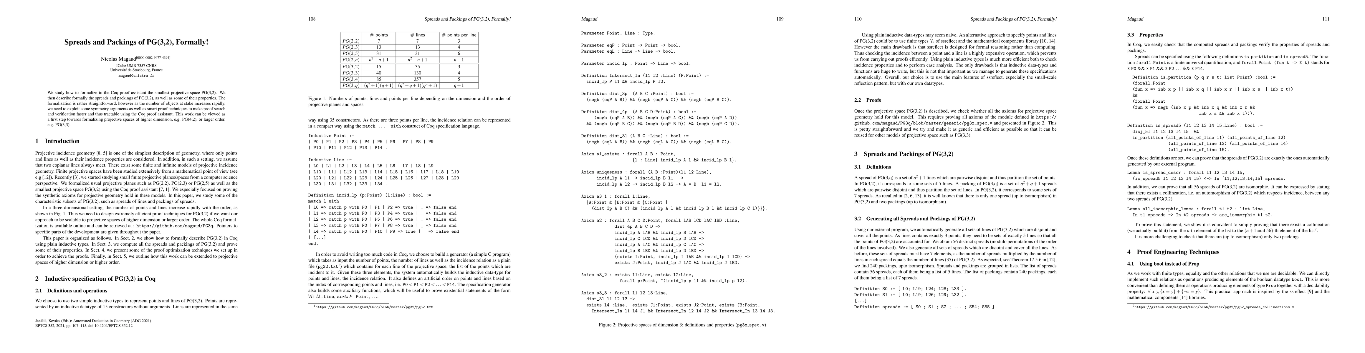 This paper formalizes the smallest projective space PG(3,2) using Coq proof assistant and describes its spreads and packings, laying groundwork for higher-dimensional spaces.