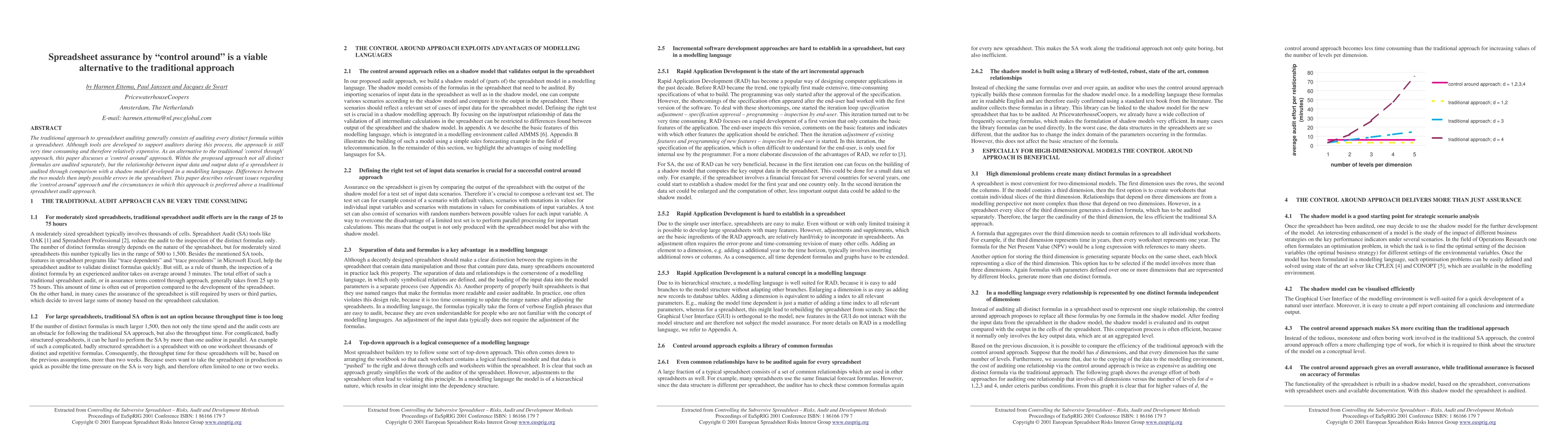 The traditional approach to spreadsheet auditing generally consists of auditing every distinct formula within a spreadsheet. Although tools are developed to support auditors during this process, the approach is still very time consuming and therefore relatively expensive. As an alternative to the traditional "control through" approach, this paper discusses a "control around" approach. Within the proposed approach not all distinct formulas are audited separately, but the relationship between input data and output data of a spreadsheet is audited through comparison with a shadow model developed in a modelling language. Differences between the two models then imply possible errors in the spreadsheet. This paper describes relevant issues regarding the "control around" approach and the circumstances in which this approach is preferred above a traditional spreadsheet audit approach.
