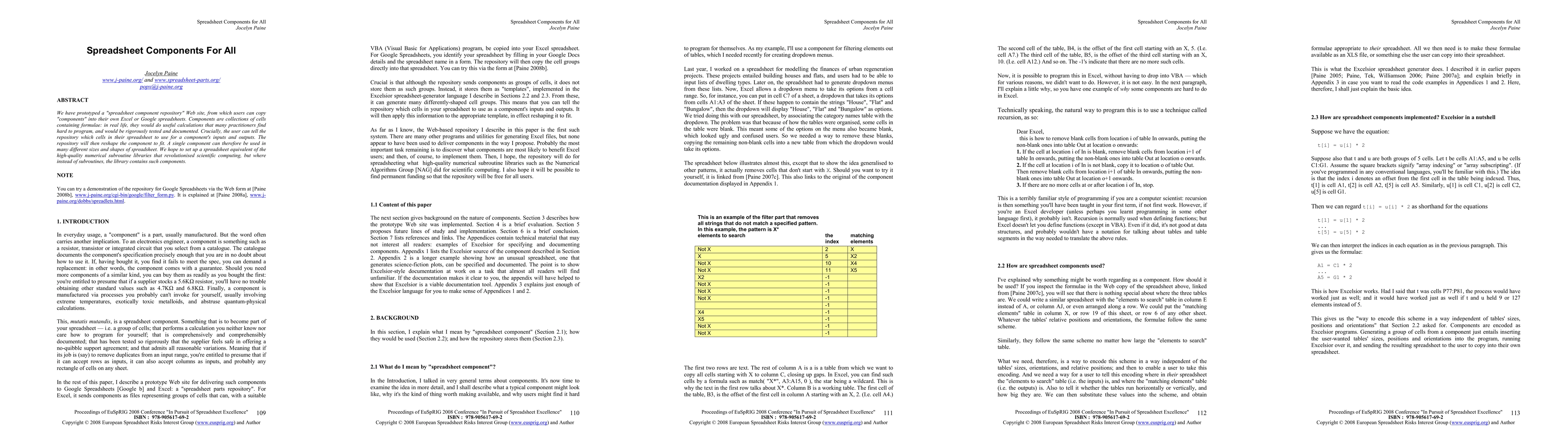 We have prototyped a "spreadsheet component repository" Web site, from which users can copy "components" into their own Excel or Google spreadsheets. Components are collections of cells containing formulae: in real life, they would do useful calculations that many practitioners find hard to program, and would be rigorously tested and documented. Crucially, the user can tell the repository which cells in their spreadsheet to use for a componen's inputs and outputs. The repository will then reshape the component to fit. A single component can therefore be used in many different sizes and shapes of spreadsheet. We hope to set up a spreadsheet equivalent of the high-quality numerical subroutine libraries that revolutionised scientific computing, but where instead of subroutines, the library contains such components.
