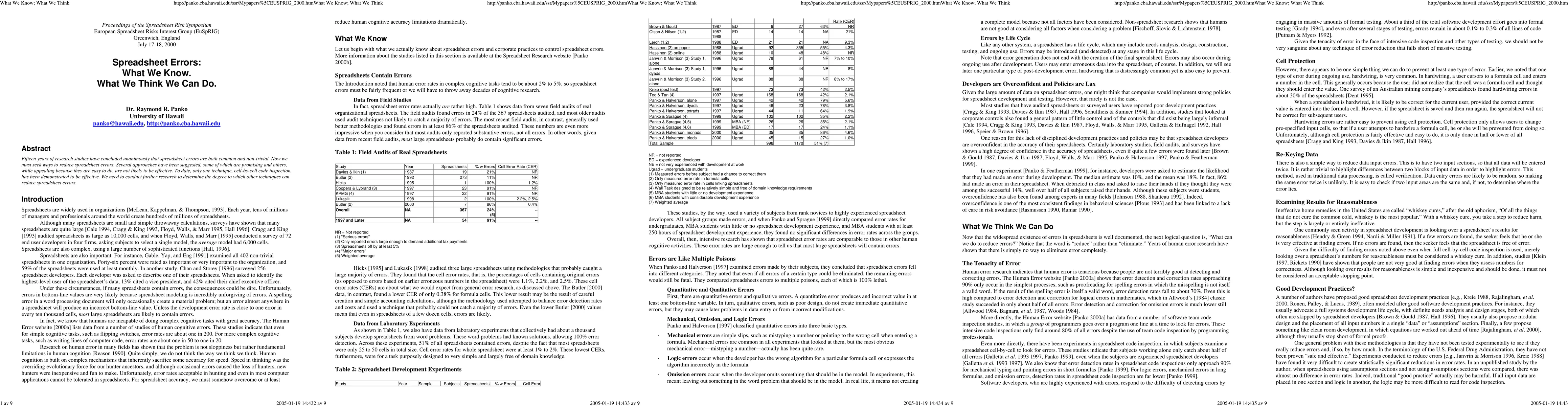 Summary: Research over fifteen years confirms the prevalence and significance of spreadsheet errors. While various methods to reduce these errors have been proposed, only cell-by-cell code inspection has proven effective. Further studies are needed to evaluate the efficacy of other techniques.