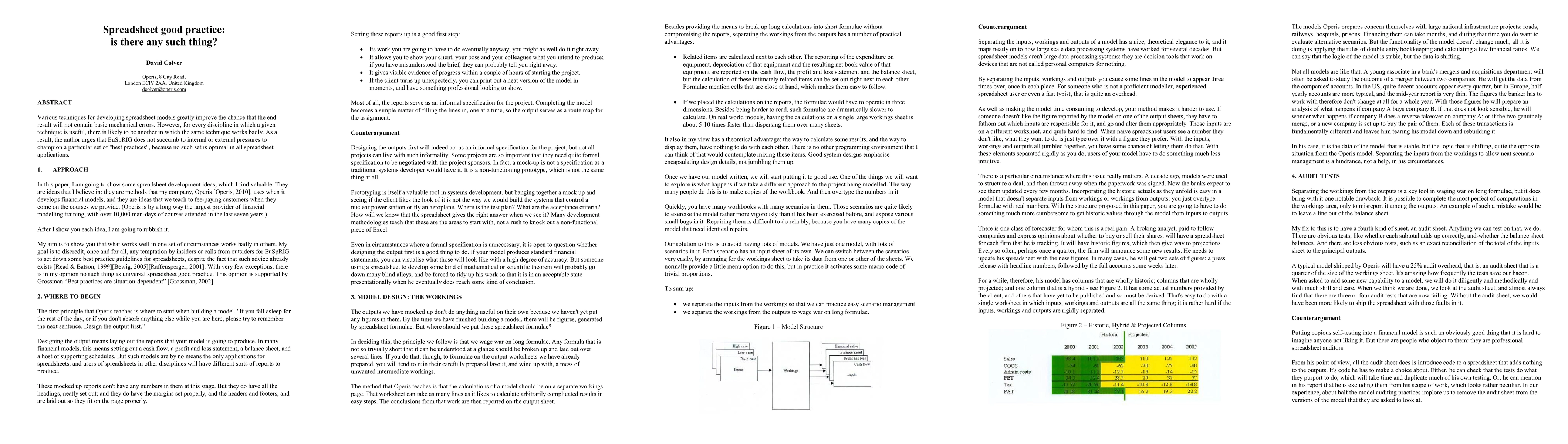 Various techniques for developing spreadsheet models greatly improve the chance that the end result will not contain basic mechanical errors. However, for every discipline in which a given technique is useful, there is likely to be another in which the same technique works badly. As a result, the author urges that EuSpRIG does not succumb to internal or external pressures to champion a particular set of "best practices", because no such set is optimal in all spreadsheet applications.