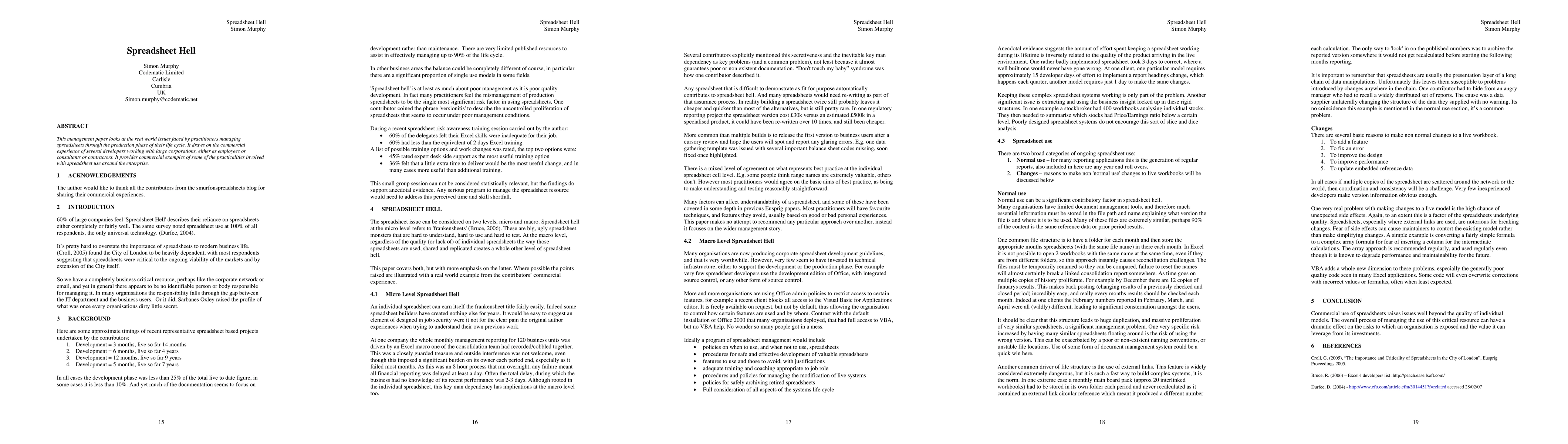 This management paper looks at the real world issues faced by practitioners managing spreadsheets through the production phase of their life cycle. It draws on the commercial experience of several developers working with large corporations, either as employees or consultants or contractors. It provides commercial examples of some of the practicalities involved with spreadsheet use around the enterprise.
